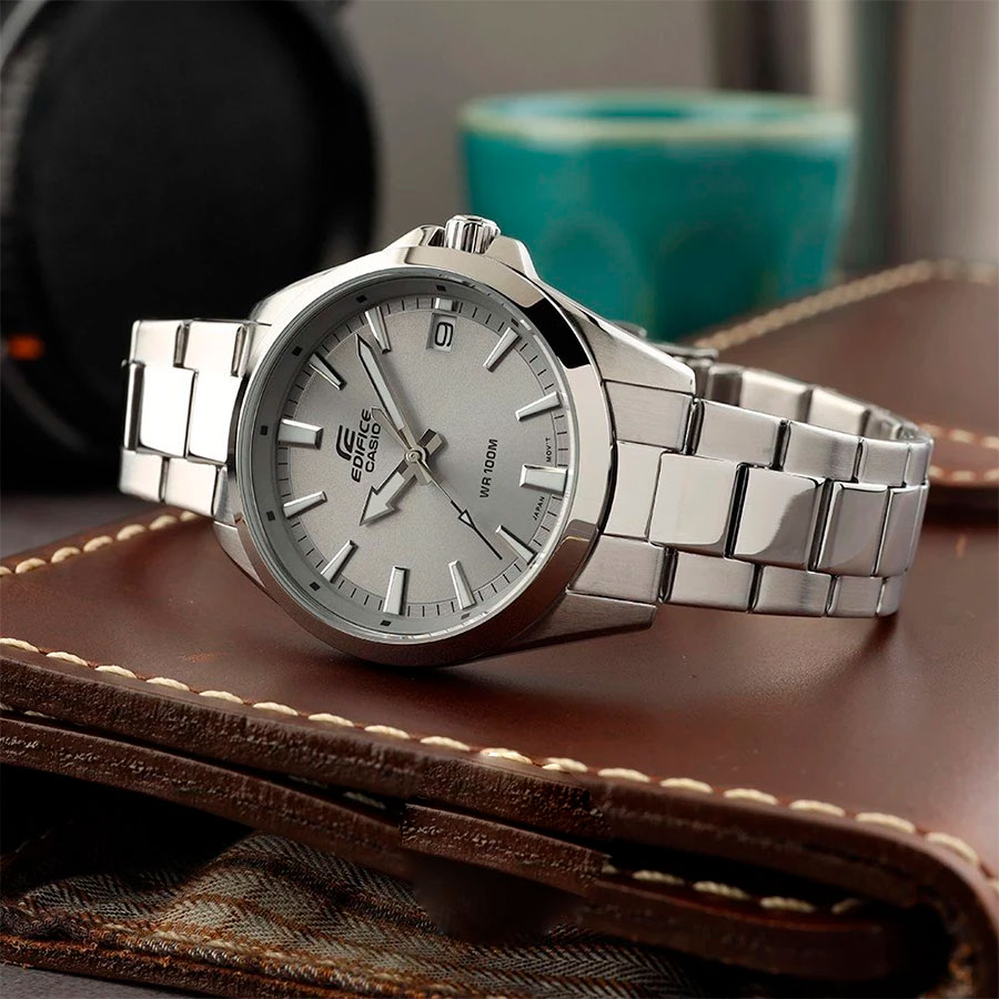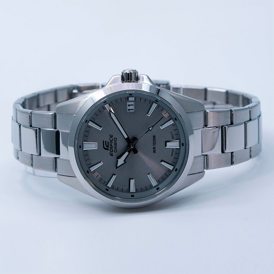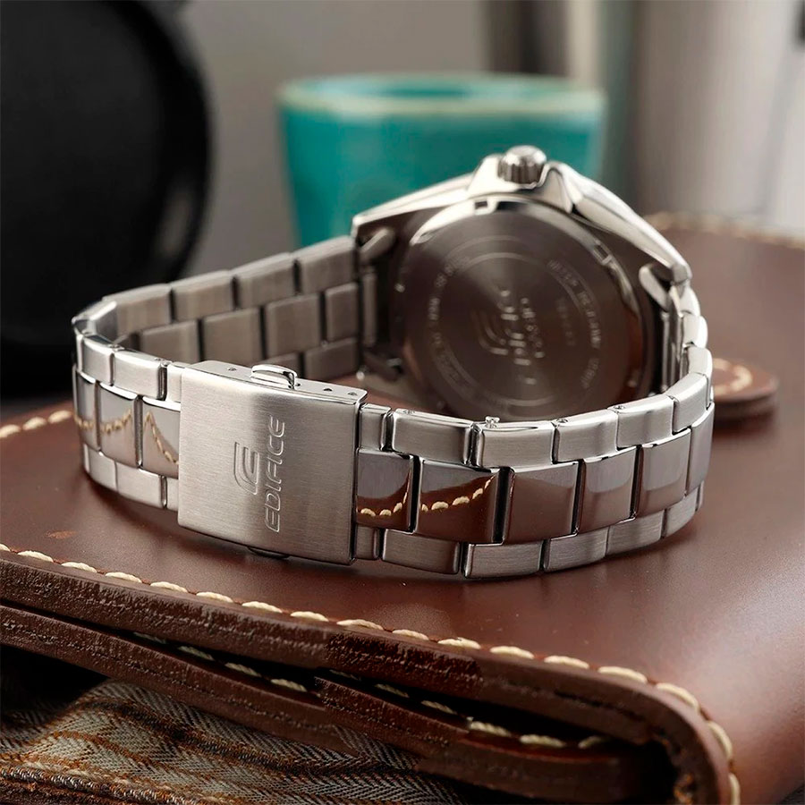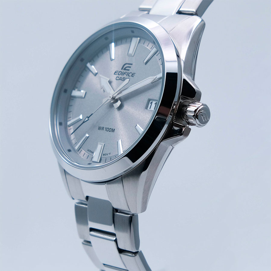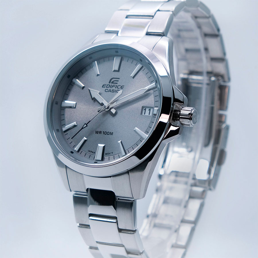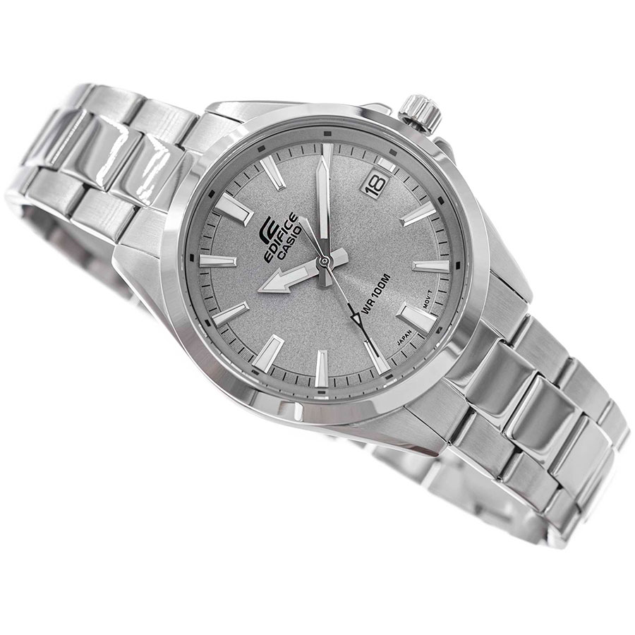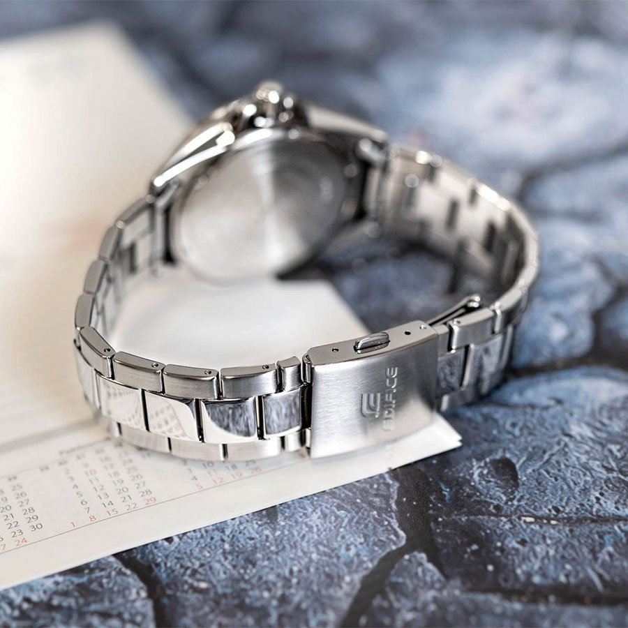Корпус и браслет выполнены из нержавеющей стали, а серый циферблат с аккуратными индексами придаёт модели сдержанную элегантность и современный вид. Завинчивающаяся задняя крышка повышает влагозащиту и защищает механизм от пыли. Дизайн часов подчеркивает философию коллекции Edifice, где сочетаются простота, баланс и внимание к деталям.