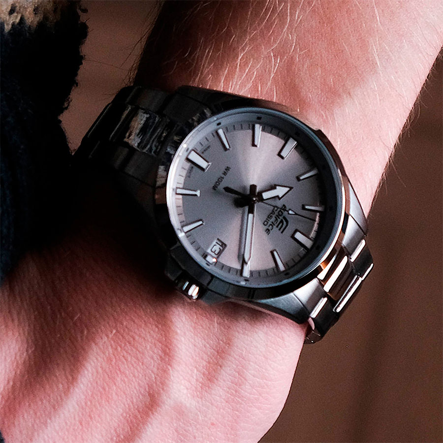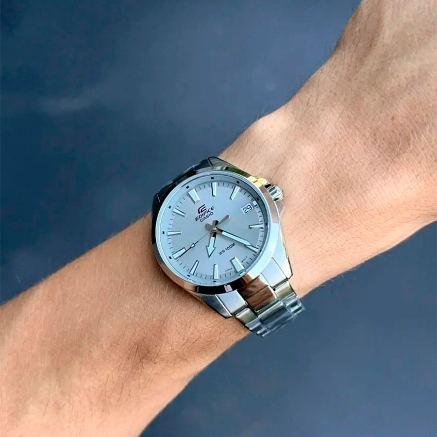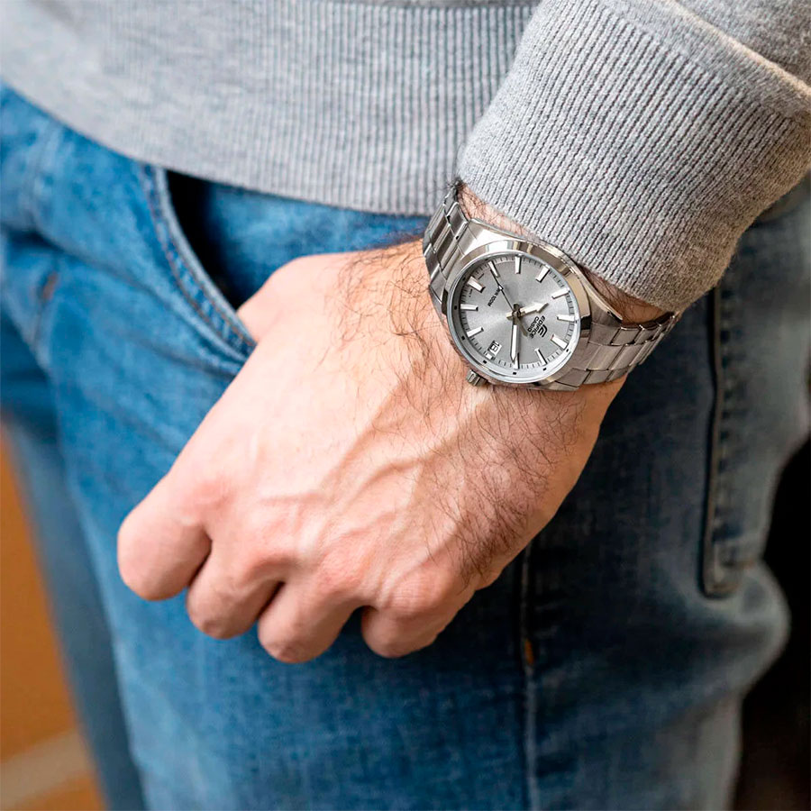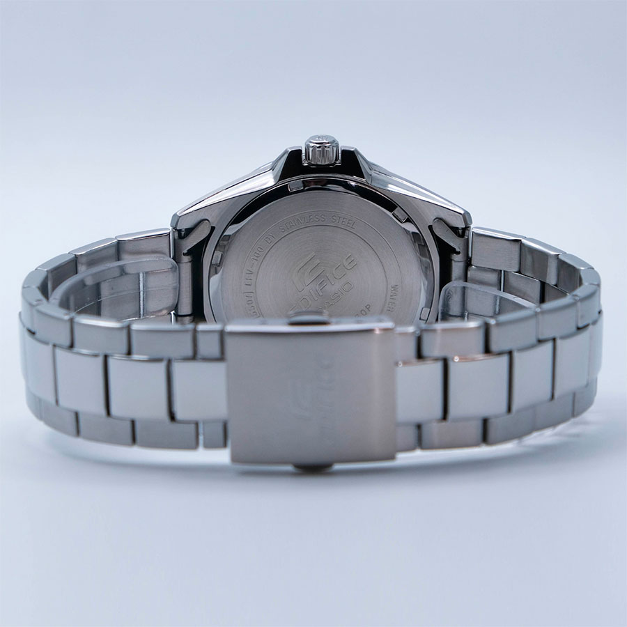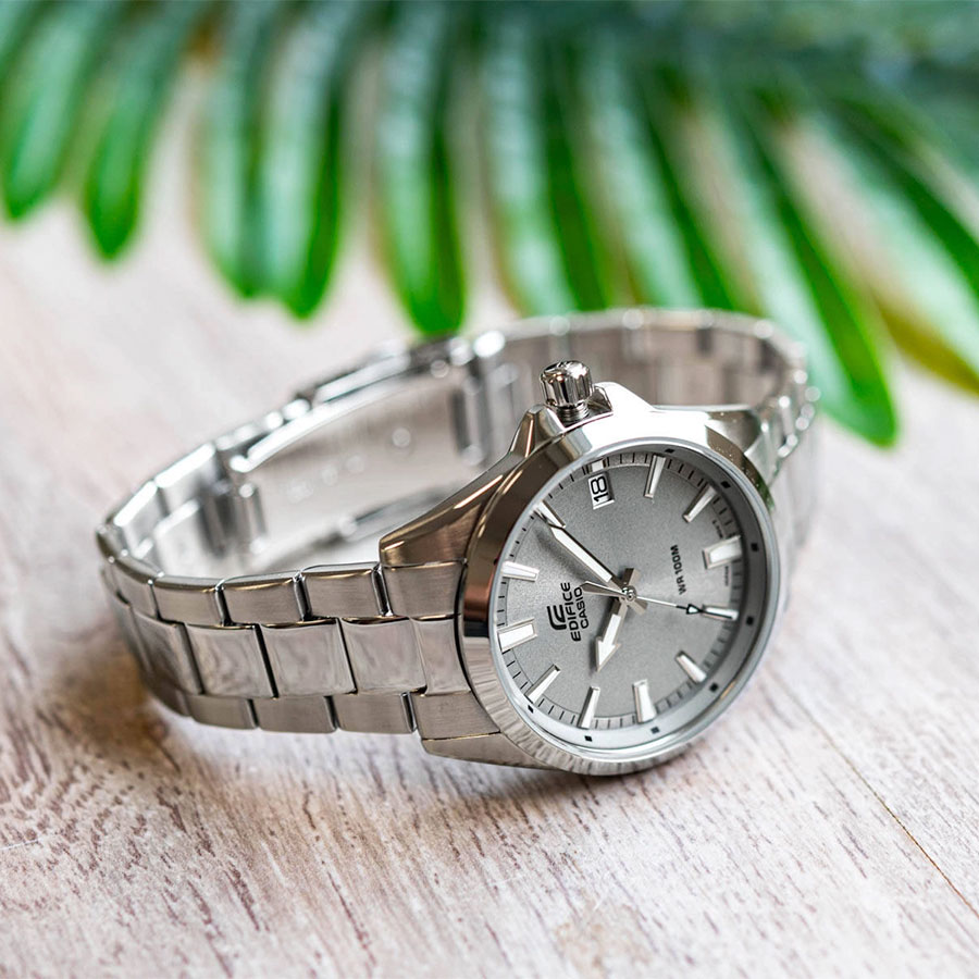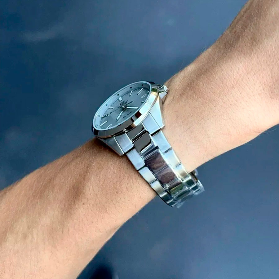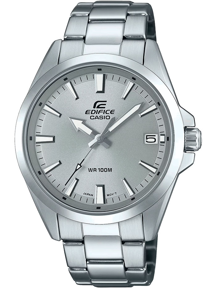 Корпус и браслет выполнены из нержавеющей стали, а серый циферблат с аккуратными индексами придаёт модели сдержанную элегантность и современный вид. Завинчивающаяся задняя крышка повышает влагозащиту и защищает механизм от пыли. Дизайн часов подчеркивает философию коллекции Edifice, где сочетаются простота, баланс и внимание к деталям.