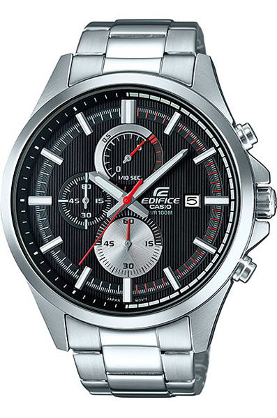 Мужские кварцевые наручные часы с хронографом (секундомером) Casio EFV-520D-1A коллекции Edifice. Калибр механизма — 5521. На данной модели отображается дата. Секундомер может отсчитывать до 59 минут 59 секунд с шагом 1/10 сек. Стрелки и метки покрыты люминесцентным напылением (светятся в темноте). Водонепроницаемость WR100 (10 атм). Завинчивающаяся задняя крышка.