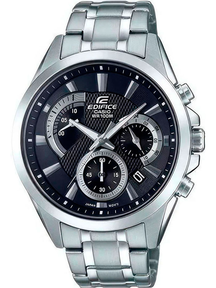 Мужские кварцевые наручные часы с хронографом (секундомером) Casio EFV-580D-1A. Коллекция Edifice. Калибр механизма — 5490. На данной модели отображается дата и время суток (24 часа). Секундомер может отсчитывать до 9 минут 59 секунд. Стрелки и метки покрыты люминесцентным напылением (светятся в темноте). Водонепроницаемость WR100 (10 атм). Завинчивающаяся задняя крышка. Размеры корпуса: (ШхВхТ) 43.8x51x11.4 мм Гарантийный срок — 3 года (1 год от производителя + 2 года от магазина).
