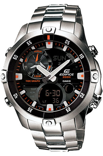 Кварцевые мужские наручные с фазой луны Casio EMA-100D-1A1 коллекции Edifice. Калибр механизма — 5299. Функциональность данной модели: формат времени 12/24, функция летнего времени (DST), мировое время 48 городов (29 часовых поясов), автоматический календарь до 2099 года, 5 независимых будильников, сигнал начала часа, секундомер с точностью 1/100 секунды и измерением до 999 часов 59 минут 59,99 cек., таймер обратного отсчета (диапазон времени 24 часа), индикатор фазы Луны для конкретной даты, возраст Луны, данные приливов для конкретной даты и времени, термометр, диодная подсветка циферблата с функцией авто (включается при наклоне часов на 40°) и люминесцентное напыление на стрелках. Данная модель обладает высокой степенью водонепроницаемости WR200 (20 атм) и подходит для глубокого погружения под воду.
