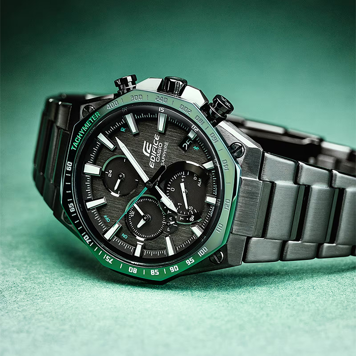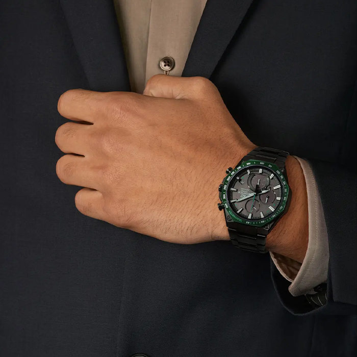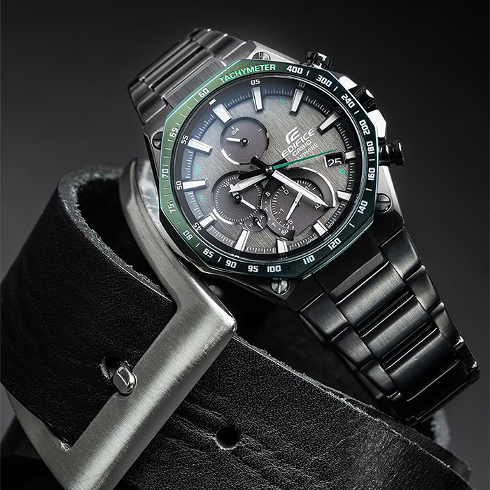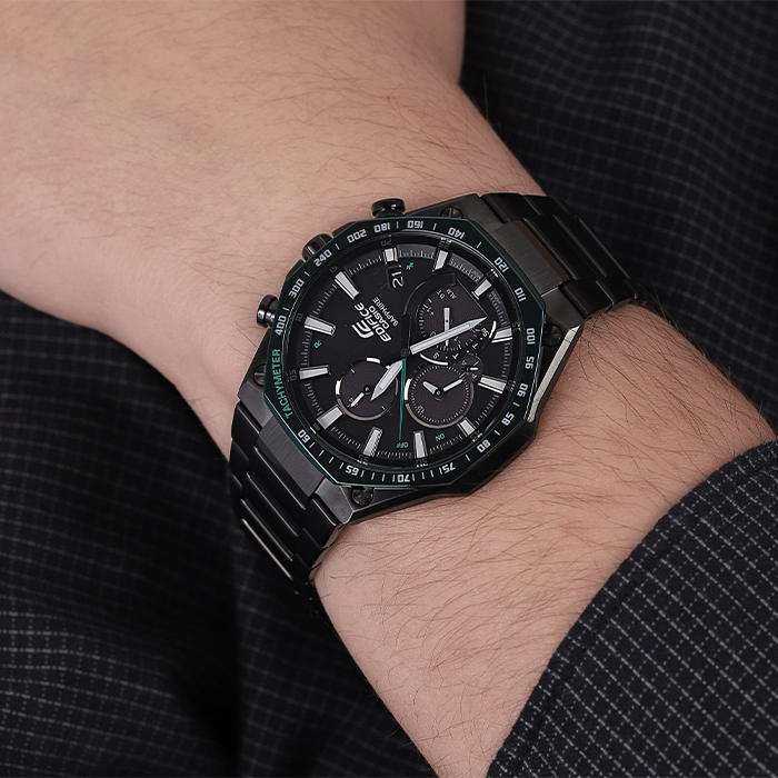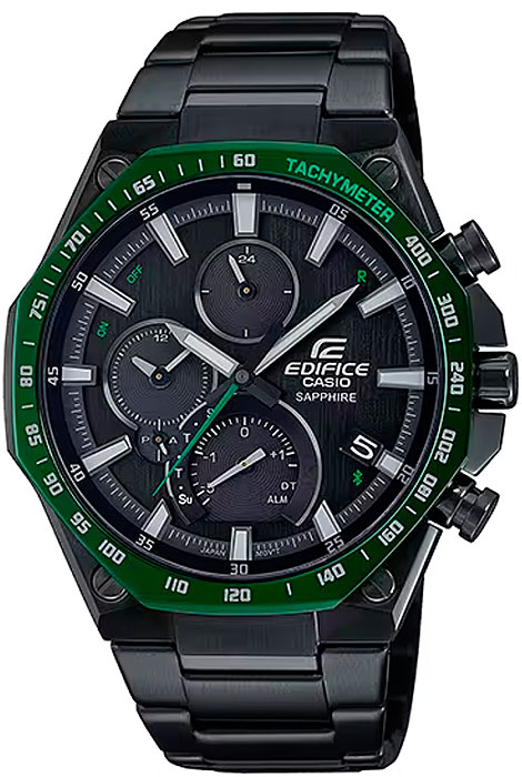 Кварцевые наручные часы на солнечной батарее Casio EQB-1100XDC-1A коллекции Edifice с технологией Bluetooth®. Тонкий корпус — 8.9 мм. Калибр механизма — 5639. Аккумулятор данной модели заряжается от любого источника света. Срок работы аккумулятора с полным зарядом — около 5 месяцев при обычном использовании без воздействия света после зарядки и 19 месяцев при хранении в полной темноте с включенной функцией энергосбережения после полной зарядки. Примерный срок службы аккумулятора — 10 лет. Имеется режим энергосбережения (стрелки останавливаются для экономии энергии, когда часы остаются в темноте). С помощью технологии Bluetooth данная модель имеет возможность поддерживать связь с системами IOS и Android. Возможности Bluetooth в данной модели: С помощью специального приложения CASIO WATCHES возможно установить время в конкретном городе (300 городов), время будильника, воспользоваться секундомером и просмотреть результаты показаний секундомера, установить точное текущее время, а также в случае потери смартфона возможно воспроизвести на нем сигнал. Функциональность данной модели: режим сохранения энергии; функция информирования о недостаточном заряде аккумулятора; индикация даты, дня недели и времени суток (24-х часовая шкала); ежедневная автоматическая корректировка точного времени по Bluetooth; автоматический календарь; будильник; двойное время; секундомер с точностью 1 секунда и измерением до 23 часов 59 минут 59 cек.; функция "Авиарежим". Стрелки и метки покрыты люминесцентным напылением (светятся в темноте). Сапфировое стекло с антибликовым покрытием. На безеле присутствует шкала тахиметра для измерения средней скорости движения. На корпус и браслет нанесено стойкое PVD покрытие. Водонепроницаемость WR100 (10 атм). Размеры корпуса: (ШxВxТ) 44.6x51.1x8.9 мм Гарантийный срок — 3 года (1 год от производителя + 2 года от магазина).