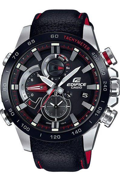 Кварцевые наручные часы на солнечной батарее Casio EQB-800BL-1A коллекции Edifice с модулем Bluetooth Smart. Калибр механизма — 5512. С помощью технологии Bluetooth Smart данная модель имеет возможность поддерживать связь с системами IOS и Android. Возможности Bluetooth в данной модели: С помощью специального приложения CASIO WATCH+ возможно установить время в конкретном городе (300 городов), время будильника, воспользоваться секундомером, установить точное текущее время, а также в случае потери смартфона возможно воспроизвести на нем сигнал. Функциональность данной модели: режим сохранения энергии; функция информирования о недостаточном заряде аккумулятора; индикация даты, дня недели и времени суток (24-х часовая шкала); ежедневная автоматическая корректировка точного времени по Bluetooth; автоматический календарь до 2099 года; будильник; двойное время; секундомер с измерением до 23 часов 59 минут 59 cек. и записью данных (время прохождения дистанции; части дистанции; лучшее время прохождения дистанции; средняя скорость) и дальнейшем просмотром этих данных на смартфоне; функция "Авиарежим". Стрелки и метки покрыты люминесцентным напылением (светятся в темноте). Завинчивающаяся заводная головка для более уверенной водонепроницаемости часов. Водонепроницаемость WR100 (10 атм).