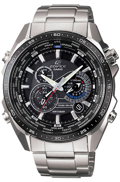Кварцевые мужские наручные часы на солнечной батарее EQS-500DB-1A1. Калибр механизма — 5123. Функциональность данной модели: режим сохранения энергии, функция летнего времени (DST), мировое время 29 городов (29 часовых поясов), автоматический календарь до 2099 года (индикация даты и дня недели), индикация времени суток (24-х часовая шкала), будильник, секундомер с измерением до 23 минут 59 cек., люминесцентное напыление на стрелках и метках (светятся в темноте). Водонепроницаемость WR100 (10 атм).