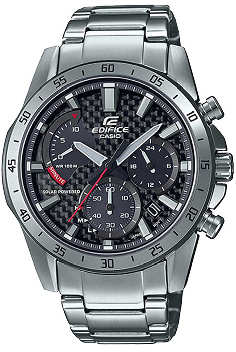 Мужские кварцевые наручные часы с хронографом (секундомером) Casio EQS-930D-1A на солнечной батарее. Коллекция Edifice. Калибр механизма — 5661. Срок работы аккумулятора с полным зарядом — около 5-ти месяцев. Примерный срок службы аккумулятора — 10 лет. Присутствует функция информирования о недостаточном заряде и индикатор степени заряда аккумулятора. На данной модели отображается дата и время суток (24 часа). Секундомер может отсчитывать до 9 минут 59 секунд с шагом 1 сек. Стрелки и метки покрыты люминесцентным напылением (светятся в темноте). Стальной браслет. Карбоновый циферблат. Завинчивающаяся задняя крышка. Водонепроницаемость WR100 (10 атм). Размеры корпуса: (ШхВхТ) 45.3x49.5x12.3 мм. Гарантийный срок — 3 года (1 год от производителя + 2 года от магазина).