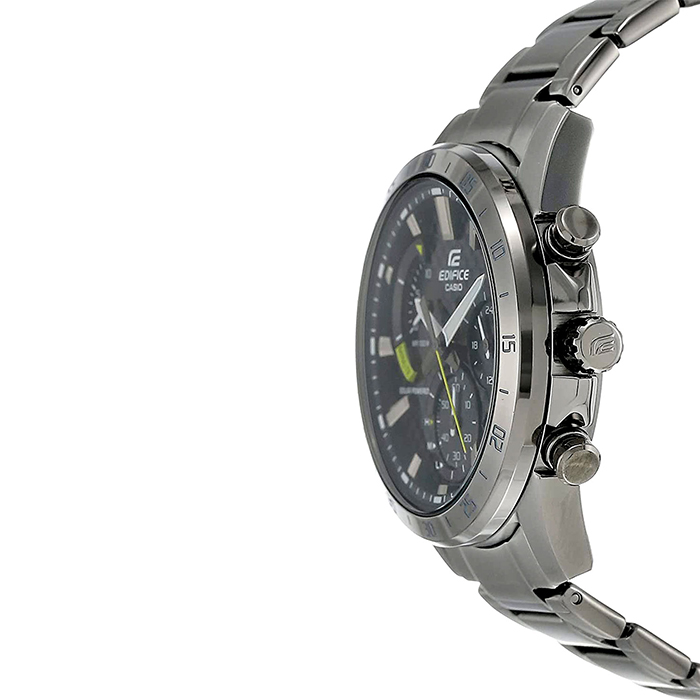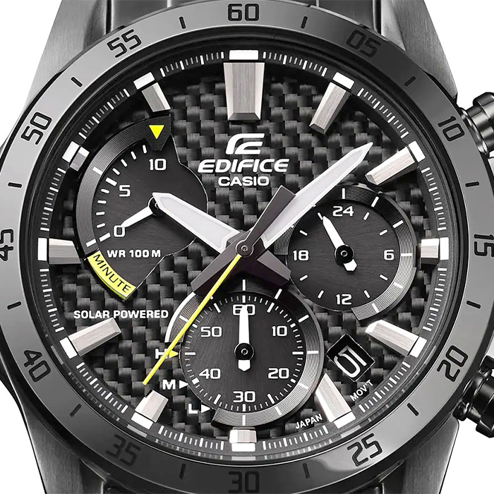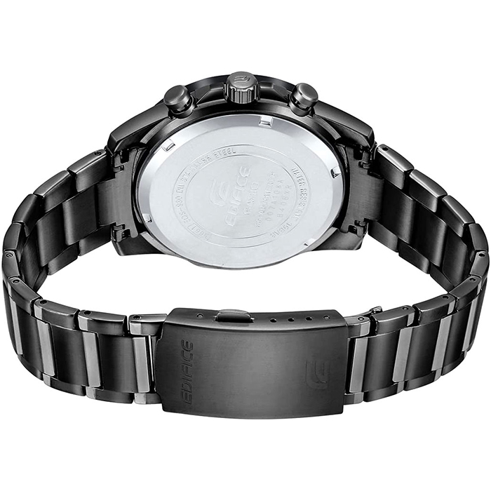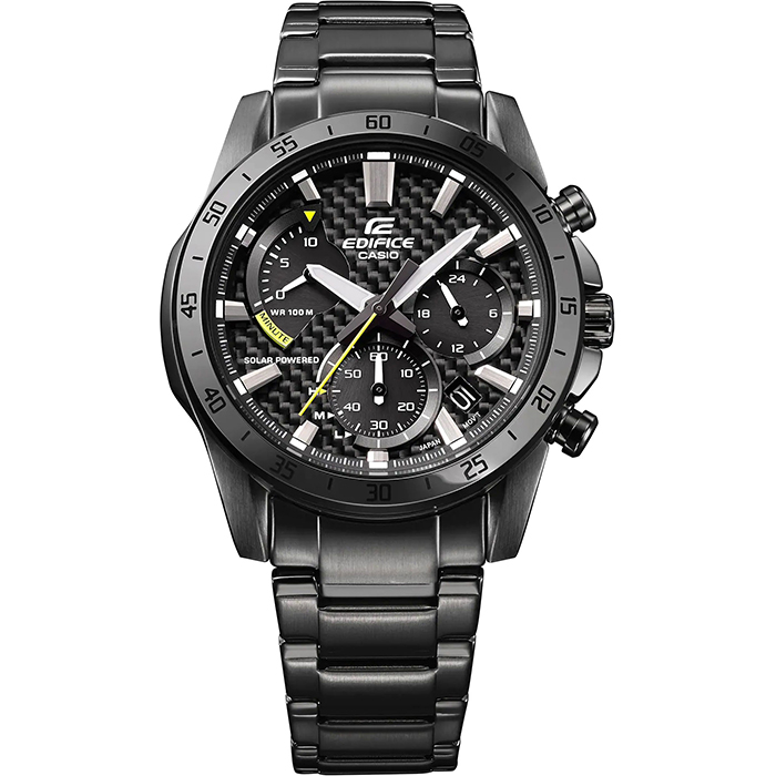 Мужские кварцевые наручные часы с хронографом (секундомером) Casio EQS-930DC-1A на солнечной батарее. Коллекция Edifice. Калибр механизма — 5661. Срок работы аккумулятора с полным зарядом — около 5-ти месяцев. Примерный срок службы аккумулятора — 10 лет. Присутствует функция информирования о недостаточном заряде и индикатор степени заряда аккумулятора. На данной модели отображается дата и время суток (24 часа). Секундомер может отсчитывать до 9 минут 59 секунд с шагом 1 сек. Стрелки и метки покрыты люминесцентным напылением (светятся в темноте). Стальной браслет. На корпус и браслет нанесено стойкое PVD покрытие. Карбоновый циферблат. Завинчивающаяся задняя крышка. Водонепроницаемость WR100 (10 атм). Размеры корпуса: (ШхВхТ) 45.3x49.5x12.3 мм. Гарантийный срок — 3 года (1 год от производителя + 2 года от магазина).