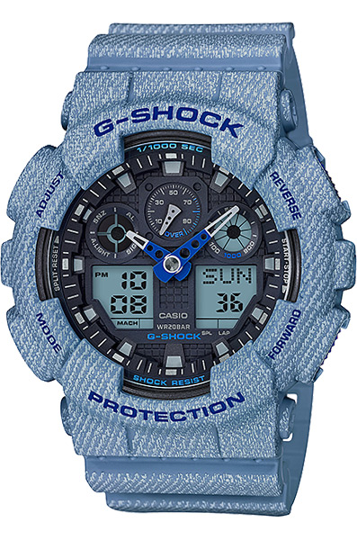 Противоударные кварцевые мужские наручные часы Casio GA-100DE-2A коллекции G-Shock цифровой+стрелочной индикацией времени. Калибр механизма — 5081. Функциональность данной модели: формат времени 12/24, автоматический календарь до 2099 года, функция летнего времени (DST), мировое время 48 городов (29 часовых поясов), 5 независимых будильников, сигнал начала часа, секундомер с точностью 1/1000 секунды и измерением до 99 часов 59 минут 59,99 cек., функция расчета средней скорости движения, таймер обратного отсчета (диапазон времени 24 часа), диодная подсветка циферблата с функцией авто (включается при наклоне часов на 40°). Водонепроницаемость WR200 (20 атм).