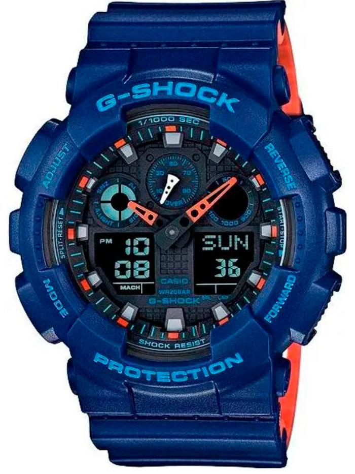 Противоударные кварцевые мужские наручные часы Casio GA-100L-2A коллекции G-Shock цифровой+стрелочной индикацией времени. Калибр механизма — 5081. Функциональность данной модели: формат времени 12/24, автоматический календарь до 2099 года, функция летнего времени (DST), мировое время 48 городов (29 часовых поясов), 5 независимых будильников, сигнал начала часа, секундомер с точностью 1/1000 секунды и измерением до 99 часов 59 минут 59,99 cек., функция расчета средней скорости движения, таймер обратного отсчета (диапазон времени 24 часа), диодная подсветка циферблата с функцией авто (включается при наклоне часов на 40°). Водонепроницаемость WR200 (20 атм). Размеры корпуса: Диаметр 50.5 мм; толщина 16.5 мм Гарантийный срок — 3 года (1 год от производителя + 2 года от магазина).