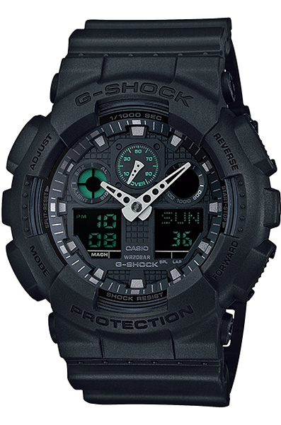 Противоударные кварцевые мужские наручные часы Casio GA-100MB-1A коллекции G-Shock цифровой+стрелочной индикацией времени. Калибр механизма — 5081. Функциональность данной модели: формат времени 12/24, автоматический календарь до 2099 года, функция летнего времени (DST), мировое время 48 городов (29 часовых поясов), 5 независимых будильников, сигнал начала часа, секундомер с точностью 1/1000 секунды и измерением до 99 часов 59 минут 59,99 cек., функция расчета средней скорости движения, таймер обратного отсчета (диапазон времени 24 часа), диодная подсветка циферблата с функцией авто (включается при наклоне часов на 40°). Водонепроницаемость WR200 (20 атм).