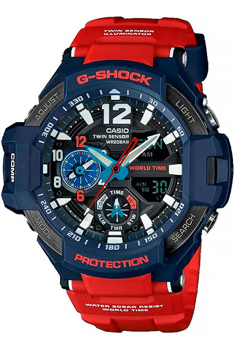 Противоударные кварцевые мужские наручные часы Casio GA-1100-2A коллекции G-Shock Gravitymaster с компасом и термометром. Эта модель из серии G-Shock Gravitymaster для пилотов, работающих в суровых условиях. Калибр механизма — 5441. Функциональность данной модели: формат времени 12/24, автоматический календарь до 2099 года, функция летнего времени (DST), мировое время 48 городов (31 часовой пояс), двойное время, 5 независимых будильников, сигнал начала часа, секундомер с точностью 1/100 секунды и измерением до 1 часа, таймер обратного отсчета (диапазон времени 60 минут), диодная подсветка циферблата с функцией авто (включается при наклоне часов на 40°) и возможностью выбора времени свечения (1.5 или 3 секунды), цифровой компас, термометр для измерения температуры окружающей среды, функция перемещения стрелок (помогает определить значения в окошке с цифровой индикацией, когда стрелки его закрывают), функция выключения звука нажатия кнопок (Mute). Стрелки и метки покрыты необритовым (Neobrite) люминесцентным напылением (светятся в темноте). Сферическое минеральное стекло. Корпус изготовлен из нержавеющей стали и пластика. На стальную часть корпуса нанесено стойкое PVD покрытие. Водонепроницаемость WR200 (20 атм). Размеры корпуса: (ШxВxТ) 52.1x50.8x16.9 мм. Гарантийный срок — 3 года (1 год от производителя + 2 года от магазина).