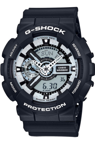 Противоударные кварцевые мужские наручные часы Casio GA-110BW-1A коллекции G-Shock цифровой+стрелочной индикацией времени. Калибр механизма — 5146. Функциональность данной модели: формат времени 12/24, автоматический календарь до 2099 года, функция летнего времени (DST), мировое время 48 городов (29 часовых поясов), 5 независимых будильников, сигнал начала часа, секундомер с точностью 1/1000 секунды и измерением до 99 часов 59 минут 59,99 cек., функция расчета средней скорости движения, таймер обратного отсчета (диапазон времени 24 часа), диодная подсветка циферблата с функцией авто (включается при наклоне часов на 40°). Водонепроницаемость WR200 (20 атм).