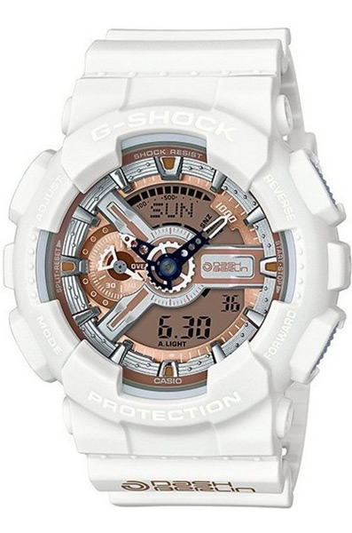 Противоударные кварцевые мужские наручные часы Casio GA-110DB-7A Dash Berlin коллекции G-Shock цифровой+стрелочной индикацией времени. Калибр механизма — 5146. Функциональность данной модели: формат времени 12/24, автоматический календарь до 2099 года, функция летнего времени (DST), мировое время 48 городов (29 часовых поясов), 5 независимых будильников, сигнал начала часа, секундомер с точностью 1/1000 секунды и измерением до 99 часов 59 минут 59,99 cек., функция расчета средней скорости движения, таймер обратного отсчета (диапазон времени 24 часа), диодная подсветка циферблата с функцией авто (включается при наклоне часов на 40°). Водонепроницаемость WR200 (20 атм).