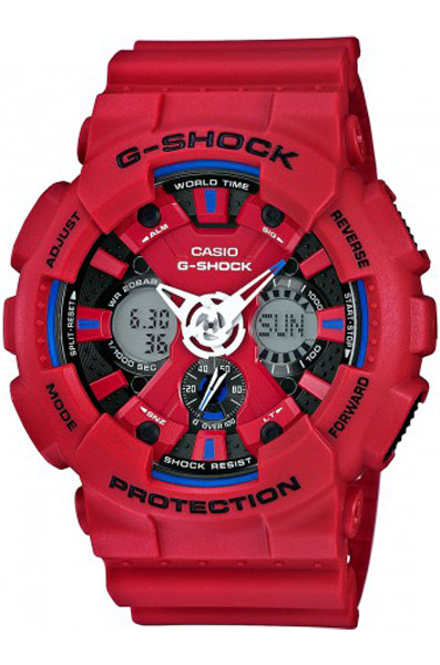 Противоударные кварцевые мужские наручные часы Casio GA-120TR-4A коллекции G-Shock цифровой+стрелочной индикацией времени. Калибр механизма — 5229. Функциональность данной модели: формат времени 12/24, автоматический календарь до 2099 года, функция летнего времени (DST), мировое время 48 городов (29 часовых поясов), 5 независимых будильников, сигнал начала часа, секундомер с точностью 1/1000 секунды и измерением до 99 часов 59 минут 59,99 cек., функция расчета средней скорости движения, таймер обратного отсчета (диапазон времени 24 часа), диодная подсветка циферблата с функцией авто (включается при наклоне часов на 40°). Водонепроницаемость WR200 (20 атм).
