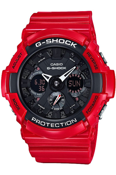 Противоударные кварцевые мужские наручные часы Casio GA-201RD-4A коллекции G-Shock цифровой+стрелочной индикацией времени. Калибр механизма — 5229. Функциональность данной модели: формат времени 12/24, автоматический календарь до 2099 года, функция летнего времени (DST), мировое время 48 городов (29 часовых поясов), 5 независимых будильников, сигнал начала часа, секундомер с точностью 1/1000 секунды и измерением до 99 часов 59 минут 59,99 cек., функция расчета средней скорости движения, таймер обратного отсчета (диапазон времени 24 часа), диодная подсветка циферблата с функцией авто (включается при наклоне часов на 40°). Водонепроницаемость WR200 (20 атм).