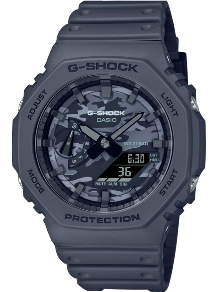 Противоударные кварцевые наручные часы Casio GA-2100CA-8A коллекции G-Shock с цифровой+стрелочной индикацией времени. Тонкий корпус для данной коллекции — 11.8 мм. Калибр механизма — 5611. Корпус усилен углеродным волокном, изготовленным по технологии Carbon Core Guard. Функциональность данной модели: формат времени 12/24, автоматический календарь до 2099 года, функция летнего времени (DST), мировое время 48 городов (29 часовых поясов), 5 независимых будильников, сигнал начала часа, секундомер с точностью 1/100 секунды и измерением до 23 часов 59 минут 59 cек., таймер обратного отсчета (диапазон времени 24 часа), диодная подсветка циферблата, функция выключения звука кнопок (Mute), смещение стрелок для удобного просмотра информации на цифровом экране. Водонепроницаемость WR200 (20 атм). Размеры корпуса: (ШxВxТ) 45.4x48.5x11.8 мм. Гарантийный срок — 3 года (1 год от производителя + 2 года от магазина).