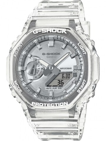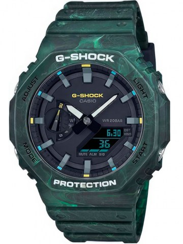 Противоударные кварцевые мужские наручные часы Casio GA-2110SU-3A коллекции G-Shock с цифровой+стрелочной индикацией времени. Тонкий корпус для данной коллекции — 11.8 мм. Калибр механизма — 5611. Корпус усилен углеродным волокном. Функциональность данной модели: формат времени 12/24, автоматический календарь до 2099 года, функция летнего времени (DST), мировое время 48 городов (29 часовых поясов), 5 независимых будильников, сигнал начала часа, секундомер с точностью 1/100 секунды и измерением до 23 часов 59 минут 59 cек., таймер обратного отсчета (диапазон времени 24 часа), диодная подсветка циферблата, функция выключения звука кнопок (Mute), смещение стрелок для удобного просмотра информации на цифровом экране. Водонепроницаемость WR200 (20 атм). Размеры корпуса: (ШxВxТ) 45.4x48.5x11.8 мм. Гарантийный срок — 3 года (1 год от производителя + 2 года от магазина).