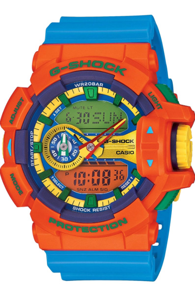 Противоударные кварцевые мужские наручные часы Casio GA-400-4A коллекции G-Shock цифровой+стрелочной индикацией времени. Калибр механизма — 5398. Функциональность данной модели: формат времени 12/24, автоматический календарь до 2099 года, функция летнего времени (DST), мировое время 48 городов (31 часовой пояс), 5 независимых будильников, сигнал начала часа, секундомер с точностью 1/100 секунды и измерением до 23 часов 59 минут 59,99 cек., таймер обратного отсчета (диапазон времени 24 часа), функция включение/выключение звука кнопок, диодная подсветка циферблата с функцией авто (включается при наклоне часов на 40°). Водонепроницаемость WR200 (20 атм).