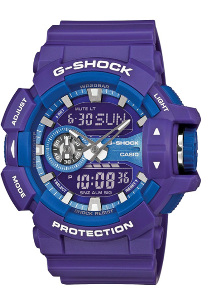 Противоударные кварцевые мужские наручные часы Casio GA-400A-6A коллекции G-Shock цифровой+стрелочной индикацией времени. Калибр механизма — 5398. Функциональность данной модели: формат времени 12/24, автоматический календарь до 2099 года, функция летнего времени (DST), мировое время 48 городов (31 часовой пояс), 5 независимых будильников, сигнал начала часа, секундомер с точностью 1/100 секунды и измерением до 23 часов 59 минут 59,99 cек., таймер обратного отсчета (диапазон времени 24 часа), функция включение/выключение звука кнопок, диодная подсветка циферблата с функцией авто (включается при наклоне часов на 40°). Водонепроницаемость WR200 (20 атм).