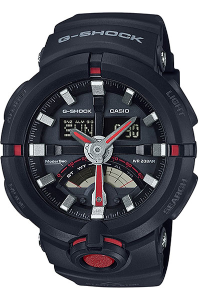 Противоударные кварцевые мужские наручные часы Casio GA-500-1A4 коллекции G-Shock цифровой+стрелочной индикацией времени. Калибр механизма — 5478. Функциональность данной модели: формат времени 12/24, автоматический календарь до 2099 года, функция летнего времени (DST), мировое время 48 городов (31 часовой пояс), 5 независимых будильников, сигнал начала часа, секундомер с точностью 1/100 секунды и измерением до 23 часов 59 минут 59,99 cек., таймер обратного отсчета (диапазон времени 60 минут), функция включение/выключение звука кнопок, диодная подсветка циферблата. Водонепроницаемость WR200 (20 атм).