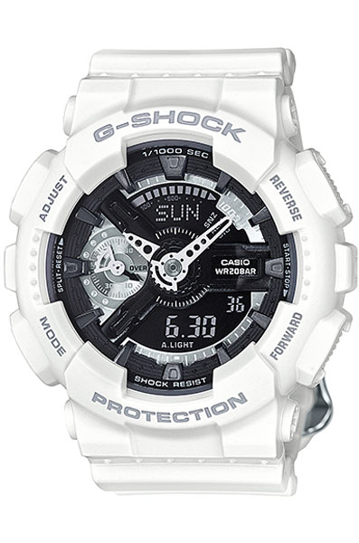 Противоударные кварцевые наручные часы Casio GMA-S110CW-7A1 коллекции G-Shock цифровой+стрелочной индикацией времени. Калибр механизма — 5425. Функциональность данной модели: формат времени 12/24, автоматический календарь до 2099 года, функция летнего времени (DST), мировое время 48 городов (29 часовых поясов), 5 независимых будильников, сигнал начала часа, секундомер с точностью 1/1000 секунды и измерением до 99 часов 59 минут 59,99 cек., функция расчета средней скорости движения, таймер обратного отсчета (диапазон времени 24 часа), диодная подсветка циферблата с функцией авто (включается при наклоне часов на 40°). Водонепроницаемость WR200 (20 атм).