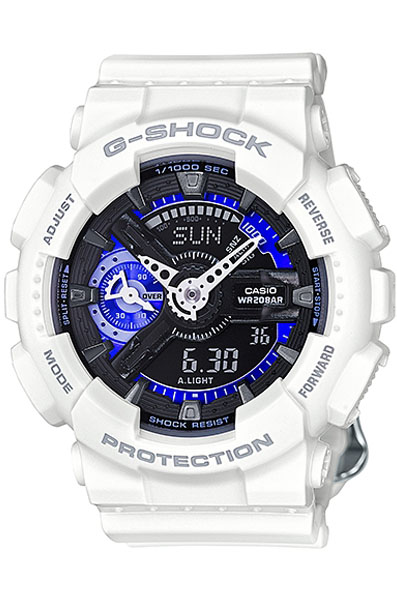 Противоударные кварцевые наручные часы Casio GMA-S110CW-7A3 коллекции G-Shock цифровой+стрелочной индикацией времени. Калибр механизма — 5425. Функциональность данной модели: формат времени 12/24, автоматический календарь до 2099 года, функция летнего времени (DST), мировое время 48 городов (29 часовых поясов), 5 независимых будильников, сигнал начала часа, секундомер с точностью 1/1000 секунды и измерением до 99 часов 59 минут 59,99 cек., функция расчета средней скорости движения, таймер обратного отсчета (диапазон времени 24 часа), диодная подсветка циферблата с функцией авто (включается при наклоне часов на 40°). Водонепроницаемость WR200 (20 атм).