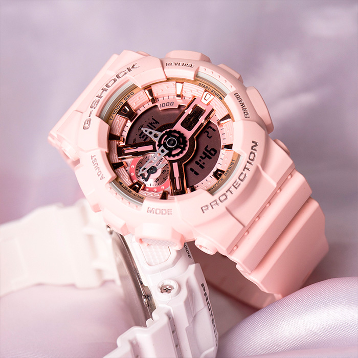 Противоударные кварцевые наручные часы Casio GMA-S110MP-4A1 коллекции G-Shock цифровой+стрелочной индикацией времени. Калибр механизма — 5425. Функциональность данной модели: формат времени 12/24, автоматический календарь до 2099 года, функция летнего времени (DST), мировое время 48 городов (29 часовых поясов), 5 независимых будильников, сигнал начала часа, секундомер с точностью 1/1000 секунды и измерением до 99 часов 59 минут 59,99 cек., функция расчета средней скорости движения, таймер обратного отсчета (диапазон времени 24 часа), диодная подсветка циферблата с функцией авто (включается при наклоне часов на 40°). Водонепроницаемость WR200 (20 атм). Размеры корпуса: Диаметр 45.5 мм; толщина 14.9 мм Гарантийный срок — 3 года (1 год от производителя + 2 года от магазина).