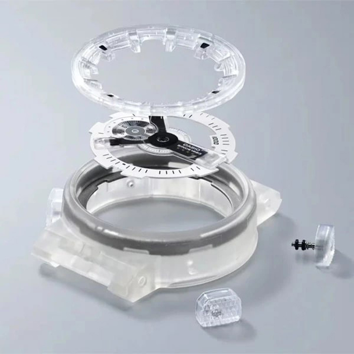 Противоударные женские кварцевые наручные часы Casio GMA-S114RX-7A коллекции G-Shock цифровой+стрелочной индикацией времени. Лимитированная серия линейки G-SHOCK Clear Remix, посвященной 40-летию G-SHOCK. Выпущено ограниченное количество экземпляров данной модели часов. Прозрачные материалы для ремешка, корпуса, циферблата, ЖК-дисплея и кнопок позволяют заглянуть за кулисы подложки модуля с нанесенными на нее логотипами G mark и G-SHOCK. На задней крышке корпуса нанесен логотип 40th, разработанный Эриком Хейзом, а на петельке ремешка выгравированы четыре звезды в честь юбилея. Эти детали и первое в истории использование прозрачного корпуса из прозрачного стекловолокна - диамида создают неповторимый дизайн, достойный исключительной лимитированной серии G-SHOCK. Калибр механизма — 5715. Функциональность данной модели: формат времени 12/24, автоматический календарь до 2099 года, функция летнего времени (DST), мировое время 48 городов (29 часовых поясов), 5 независимых будильников, сигнал начала часа, секундомер с точностью 1/1000 секунды и измерением до 99 часов 59 минут 59,99 cек., функция расчета средней скорости движения, таймер обратного отсчета (диапазон времени 24 часа), диодная подсветка циферблата с функцией авто (включается при наклоне часов на 40°) и возможностью выбора времени свечения (1.5 или 3 секунды) + необритовое (Neobrite) покрытие на стрелках для длительного послесвечения в темноте. Водонепроницаемость WR200 (20 атм). Размеры корпуса: (ШxВxТ) 45.9x49x15.8 мм. Гарантийный срок — 3 года (1 год от производителя + 2 года от магазина).