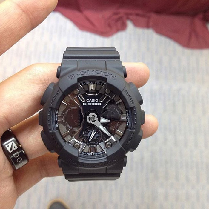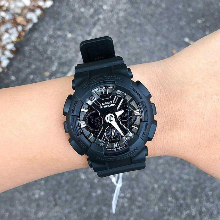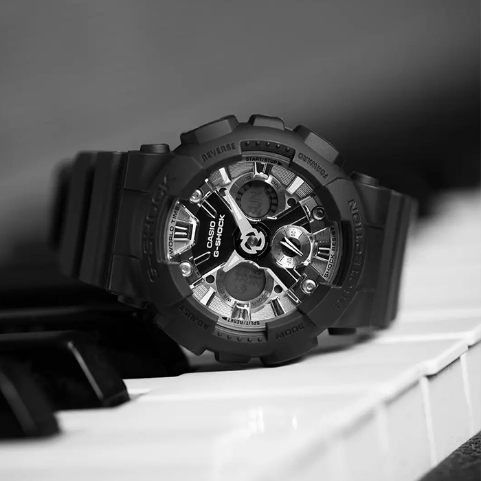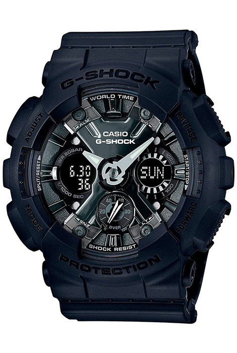 Противоударные кварцевые наручные часы Casio GMA-S120MF-1A коллекции G-Shock цифровой+стрелочной индикацией времени. Калибр механизма — 5518. Функциональность данной модели: формат времени 12/24, автоматический календарь до 2099 года, функция летнего времени (DST), мировое время 48 городов (29 часовых поясов), 5 независимых будильников, сигнал начала часа, секундомер с точностью 1/1000 секунды и измерением до 99 часов 59 минут 59,99 cек., функция расчета средней скорости движения, таймер обратного отсчета (диапазон времени 24 часа), диодная подсветка циферблата с функцией авто (включается при наклоне часов на 40°) и возможностью выбора времени свечения (1.5 или 3 секунды) + необритовое (Neobrite) покрытие на стрелках для длительного послесвечения в темноте. Водонепроницаемость WR200 (20 атм). Размеры корпуса: (ШxВxТ) 45.9x49x15.8 мм. Гарантийный срок — 3 года (1 год от производителя + 2 года от магазина).