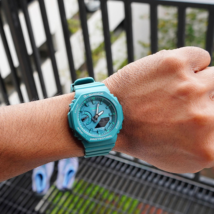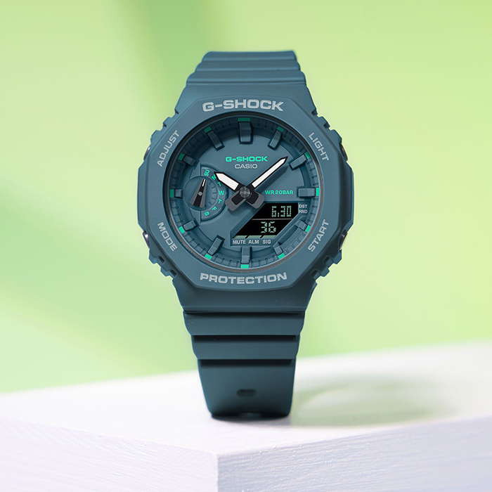 Противоударные женские кварцевые наручные часы Casio GMA-S2100GA-3A коллекции G-Shock с цифровой+стрелочной индикацией времени. Тонкий корпус для данной коллекции — 11.2 мм. Калибр механизма — 5611. Корпус усилен углеродным волокном, изготовленным по технологии Carbon Core Guard. Функциональность данной модели: формат времени 12/24, автоматический календарь до 2099 года, функция летнего времени (DST), мировое время в 48 городах (31 часовой пояс), 5 независимых будильников, сигнал начала часа, секундомер с точностью 1/100 секунды и измерением до 23 часов 59 минут 59 cек., таймер обратного отсчета (диапазон времени 24 часа), двойная диодная подсветка циферблата с возможностью выбора времени свечения (1.5 или 3 секунды) + необритовое (Neobrite) покрытие на стрелках для длительного послесвечения в темноте, функция выключения звука нажатия кнопок (Mute), функция смещения стрелок для удобного просмотра информации на цифровом экране. Водонепроницаемость WR200 (20 атм). Размеры корпуса: (ШxВxТ) 42.9x46.2x11.2 мм. Гарантийный срок — 3 года (1 год от производителя + 2 года от магазина).