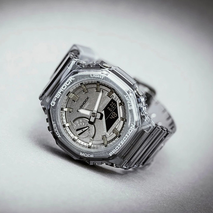 Противоударные женские кварцевые наручные часы Casio GMA-S2100SK-1A коллекции G-Shock с цифровой+стрелочной индикацией времени. Тонкий корпус для данной коллекции — 11.2 мм. Калибр механизма — 5611. Корпус усилен углеродным волокном, изготовленным по технологии Carbon Core Guard. Функциональность данной модели: формат времени 12/24, автоматический календарь до 2099 года, функция летнего времени (DST), мировое время в 48 городах (31 часовой пояс), 5 независимых будильников, сигнал начала часа, секундомер с точностью 1/100 секунды и измерением до 23 часов 59 минут 59 cек., таймер обратного отсчета (диапазон времени 24 часа), двойная диодная подсветка циферблата с возможностью выбора времени свечения (1.5 или 3 секунды) + необритовое (Neobrite) покрытие на стрелках для длительного послесвечения в темноте, функция выключения звука кнопок (Mute), функция смещения стрелок для удобного просмотра информации на цифровом экране. Водонепроницаемость WR200 (20 атм). Размеры корпуса: (ШxВxТ) 42.9x46.2x11.2 мм. Гарантийный срок — 3 года (1 год от производителя + 2 года от магазина).