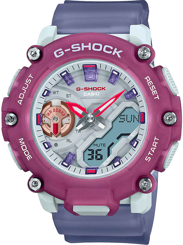 Женские противоударные кварцевые наручные часы Casio GMA-S2200PE-6A коллекции G-Shock с цифровой+стрелочной индикацией времени. Калибр механизма — 5694. Корпус усилен углеродным волокном, изготовленным по технологии Carbon Core Guard. Функциональность данной модели: формат времени 12/24, автоматический календарь до 2099 года, функция летнего времени (DST), мировое время 48 городов (31 часовой пояс), двойное время, 5 независимых будильников, сигнал начала часа, секундомер с точностью 1/100 секунды и измерением до 23 часов 59 минут 59 cек., таймер обратного отсчета (диапазон времени 24 часа), двойная диодная подсветка циферблата с возможностью выбора времени свечения (1.5 или 3 секунды) + необритовое (Neobrite) покрытие на стрелках и метках для длительного послесвечения в темноте, функция выключения звука нажатия кнопок (Mute), функция смещения стрелок для удобного просмотра информации на цифровом экране. Водонепроницаемость WR200 (20 атм). Размеры корпуса: (ШxВxТ) 45.7x48.3x12.1 мм. Гарантийный срок — 3 года (1 год от производителя + 2 года от магазина).