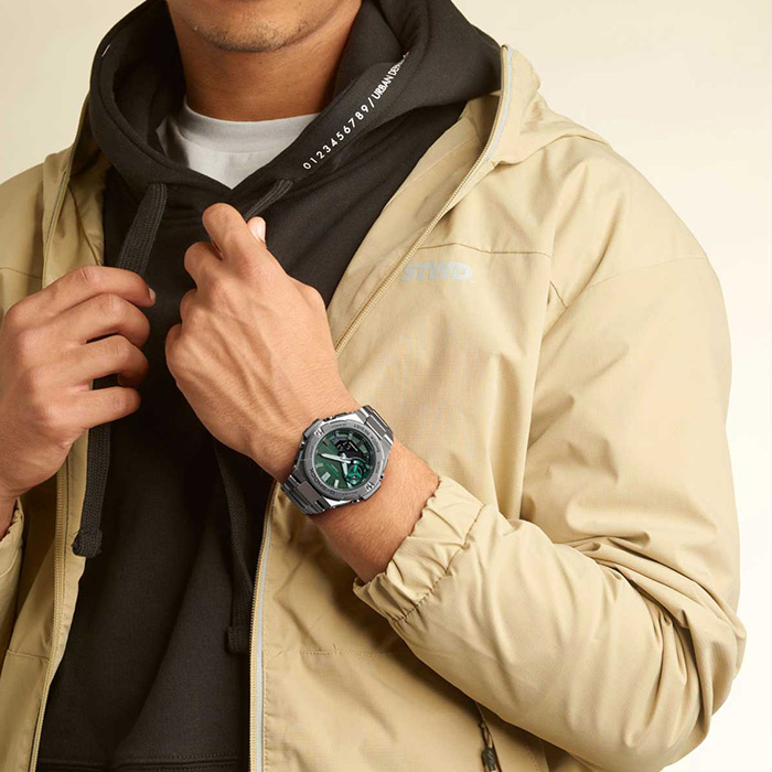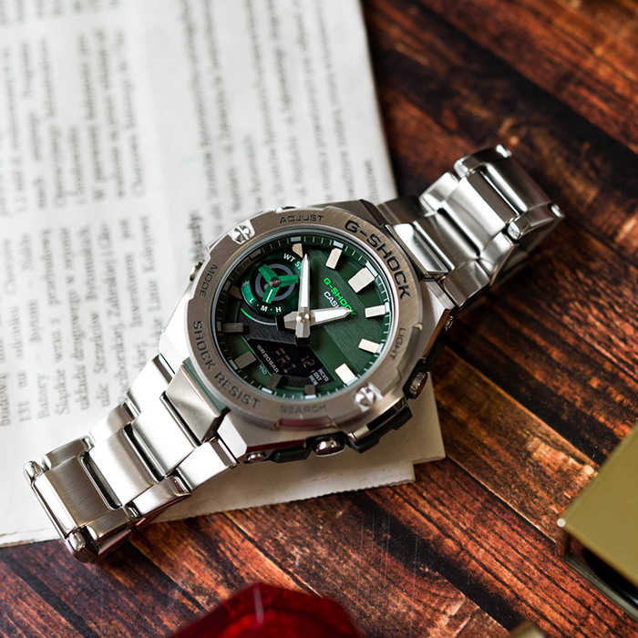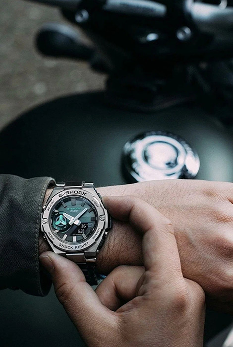 Противоударные кварцевые наручные часы на солнечной батарее Casio GST-B500AD-3A коллекции G-Shock с модулем Bluetooth Smart. Калибр механизма — 5684. Аккумулятор данной модели заряжается от любого источника света. Срок работы аккумулятора с полным зарядом — около 7-ми месяцев. Примерный срок службы аккумулятора — 10 лет. Имеется режим энергосбережение (дисплей гаснет для экономии энергии, когда часы остаются в темноте) и индикатор уровня заряда батареи. С помощью технологии Bluetooth Smart данная модель имеет возможность поддерживать связь с системами IOS и Android. Возможности Bluetooth в данной модели: c помощью специального приложения CASIO WATCHES возможно установить время в конкретном городе (300 городов), время будильника, воспользоваться секундомером, установить точное текущее время, а также в случае потери смартфона возможно воспроизвести на нем сигнал. Функциональность данной модели: отображение времени в 12-часовом или 24-часовом формате; режим сохранения энергии; индикатор уровня заряда аккумулятора; индикация даты и дня недели; возможность установки индикации дня недели на русском языке; ежедневная автоматическая корректировка точного времени по Bluetooth (4 раза в сутки); автоматический календарь до 2099 года; 5 независимых будильников; сигнал начала часа; мировое время в 38 городах (38 часовых поясов); функция летнего времени (DST); секундомер с точностью 1/100 секунды и измерением до 23 часов 59 минут 59 cек.; таймер обратного отсчета до 60 минут; функция перемещения стрелок (помогает определить значения в окошке с цифровой индикацией, когда стрелки его закрывают); двойная диодная подсветка циферблата с возможностью выбора времени свечения (1.5 или 3 секунды) + необритовое (Neobrite) покрытие на стрелках для длительного послесвечения в темноте; функция поиска телефона - можно включить тоновый сигнал на телефоне, что позволит быстро найти телефон; режим выключения звука нажатия кнопок (Mute). Пластиковый корпус в оболочке из нержавеющей стали, дополнительно усиленный углеродным волокном, изготовленным по технологии Carbon Core Guard. Браслет из нержавеющей стали. Водонепроницаемость WR200 (20 атм). Размеры корпуса: (ШxВxТ) 46.6x48.9x12.8 мм. Гарантийный срок — 3 года (1 год от производителя + 2 года от магазина).