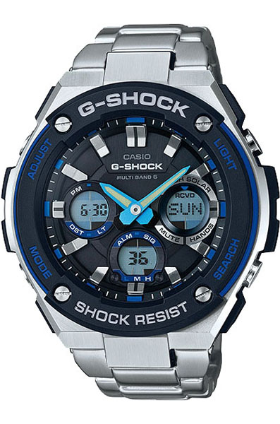 Противоударные кварцевые наручные часы на солнечной батарее Casio GST-W100D-1A2 коллекции G-Shock с радиоконтролем. Калибр механизма — 5444. Функциональность данной модели: режим сохранения энергии, индикатор заряда батареи, радиоконтроль точного времени (Wave Ceptor), формат времени 12/24, автоматический календарь до 2099 года, функция летнего времени (DST), мировое время 48 городов (29 часовых поясов), 5 независимых будильников, сигнал начала часа, секундомер с точностью 1/100 секунды и измерением до 59 минут 59,99 cек., таймер обратного отсчета (диапазон времени 100 минут). Диодная подсветка циферблата с функцией авто (включается при наклоне часов на 40°) и люминесцентное напыление на стрелках. функция выключения звука кнопок (Mute). Водонепроницаемость WR200 (20 атм).