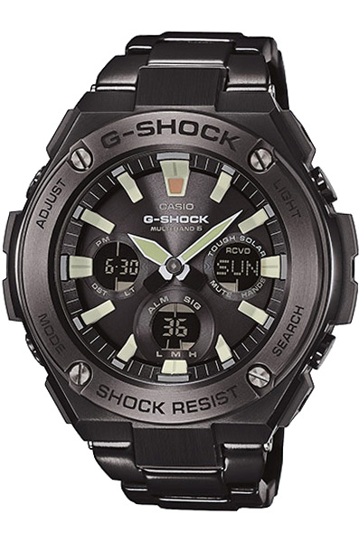 Противоударные кварцевые наручные часы на солнечной батарее Casio GST-W130BD-1A коллекции G-Shock с радиоконтролем. Калибр механизма — 5515. Функциональность данной модели: режим сохранения энергии, индикатор заряда батареи, радиоконтроль точного времени (Wave Ceptor), формат времени 12/24, автоматический календарь до 2099 года, функция летнего времени (DST), мировое время 48 городов (31 часовой пояс), 5 независимых будильников, сигнал начала часа, секундомер с точностью 1/100 секунды и измерением до 59 минут 59,99 cек., таймер обратного отсчета (диапазон времени 100 минут). Диодная подсветка циферблата с функцией авто (включается при наклоне часов на 40°) и люминесцентное напыление на стрелках. Функция выключения звука кнопок (Mute). Водонепроницаемость WR200 (20 атм).