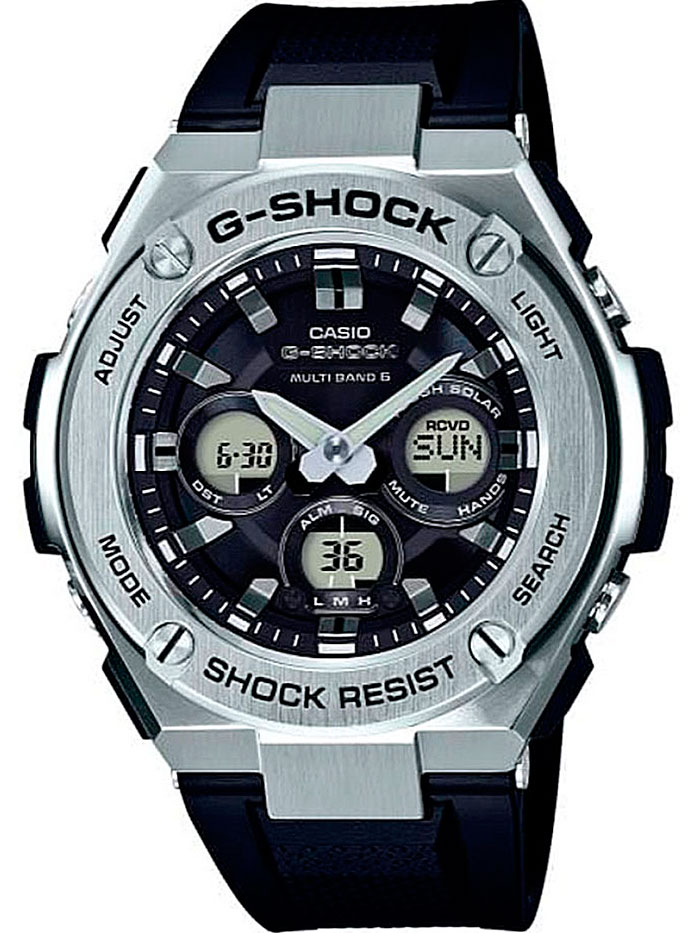 Противоударные кварцевые наручные часы на солнечной батарее Casio GST-W310-1A коллекции G-Shock с радиоконтролем. Калибр механизма — 5524. Аккумулятор данной модели заряжается от любого источника света. Срок работы аккумулятора с полным зарядом — около 5-ти месяцев. Примерный срок службы аккумулятора — 10 лет. Функциональность данной модели: режим сохранения энергии, индикатор заряда батареи, радиоконтроль точного времени (Wave Ceptor), формат времени 12/24, автоматический календарь до 2099 года, функция летнего времени (DST), мировое время 48 городов (29 часовых поясов), 5 независимых будильников, сигнал начала часа, секундомер с точностью 1/100 секунды и измерением до 59 минут 59,99 cек., таймер обратного отсчета (диапазон времени 100 минут). Диодная подсветка циферблата с функцией авто (включается при наклоне часов на 40°) и люминесцентное напыление на стрелках. функция выключения звука кнопок (Mute). Водонепроницаемость WR200 (20 атм). Размеры корпуса: (ШхВхТ) 49.3x55.9x15.3 мм Гарантийный срок — 3 года (1 год от производителя + 2 года от магазина).