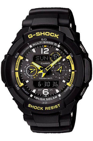 Противоударные кварцевые наручные часы на солнечной батарее Casio GW-3500B-1A коллекции G-Shock с радиоконтролем. Калибр механизма — 5173. Функциональность данной модели: режим сохранения энергии, индикатор заряда батареи, радиоконтроль точного времени (Wave Ceptor), формат времени 12/24, автоматический календарь до 2099 года, функция летнего времени (DST), мировое время 48 городов (29 часовых поясов), 5 независимых будильников, сигнал начала часа, секундомер с точностью 1/100 секунды и измерением до 23 минут 59,99 cек., таймер обратного отсчета (диапазон времени 60 минут). Диодная подсветка циферблата с функцией авто (включается при наклоне часов на 40°) и люминесцентное напыление на стрелках. Водонепроницаемость WR200 (20 атм).