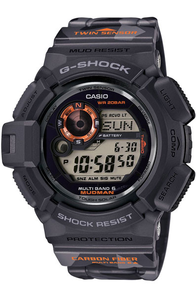 Противоударные кварцевые наручные часы на солнечной батарее Casio GW-9300CM-1E коллекции G-Shock с компасом, термометром и радиоконтролем точного времени. Серия Mudman (часы дополнительно защищены от попадания в них пыли и грязи). Калибр механизма — 3260. Функциональность данной модели: прием сигнала радиокалибровки времени; термометр (диапазон измерения и отображения: –10,0–60,0°C), цифровой компас, режим сохранения энергии, индикатор заряда батареи, формат времени 12/24, автоматический календарь до 2099 года, функция летнего времени (DST), мировое время 48 городов (31 часовой пояс), индикатор фазы и возраста луны для определенной даты, 5 независимых будильников, сигнал начала часа, секундомер с точностью 1/100 секунды и измерением до 999 часов 59 минут 59,99 cек., таймер обратного отсчета (диапазон времени 24 часа), электролюминесцентная подсветка циферблата с функцией авто (включается при наклоне часов на 40°), функция выключения звука кнопок (Mute). Водонепроницаемость WR200 (20 атм).