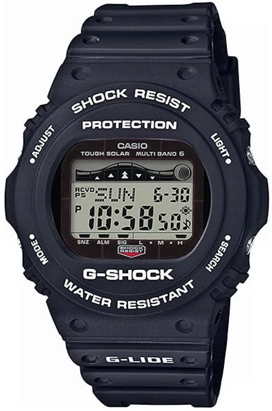 Противоударные кварцевые наручные часы на солнечной батарее Casio GWX-5700CS-1E коллекции G-Shock с графиком приливов и фазой луны. Калибр механизма — 3215. Аккумулятор данной модели заряжается от любого источника света. Срок работы аккумулятора с полным зарядом — около 10-ти месяцев. Примерный срок службы аккумулятора — 10 лет. Функциональность данной модели: режим сохранения энергии, индикатор заряда батареи, радиоконтроль точного времени (Wave Ceptor), формат времени 12/24, автоматический календарь до 2099 года, функция летнего времени (DST), мировое время 48 городов (31 часовой пояс), 5 независимых будильников, сигнал начала часа, секундомер с точностью 1/100 секунды и измерением до 59 минут 59,99 cек., два независимых таймера обратного отсчета (диапазон времени 99 минут 55 секунд каждый), электролюминесцентная подсветка циферблата с функцией авто (включается при наклоне часов на 40°), функция выключения звука кнопок (Mute). Данные о приливах/фазе Луны: индикатор фаз Луны на определенную дату; индикатор уровня прилива на определенное время. Водонепроницаемость WR200 (20 атм).