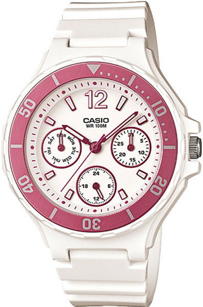 Женские кварцевые наручные часы Casio LRW-250H-4A. Калибр механизма — 2364. Стрелки и метки покрыты люминесцентным напылением (светятся в темноте). На данной модели отображается дата, день недели и время суток (24-х часовая шкала). Вращающийся безель. Размеры корпуса: Диаметр 37.5 мм; толщина 11.3 мм Гарантийный срок — 3 года (1 год от производителя + 2 года от магазина).