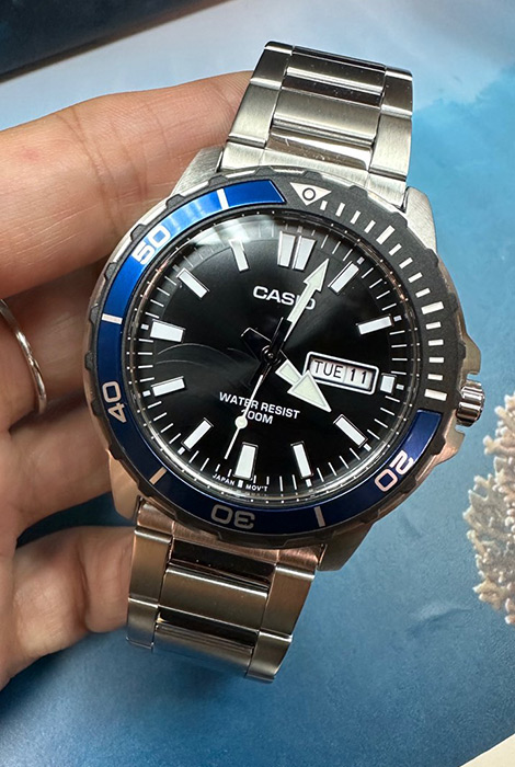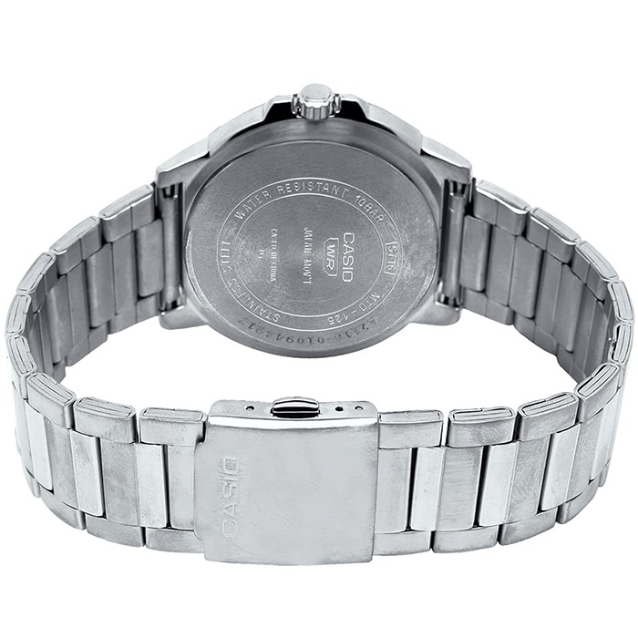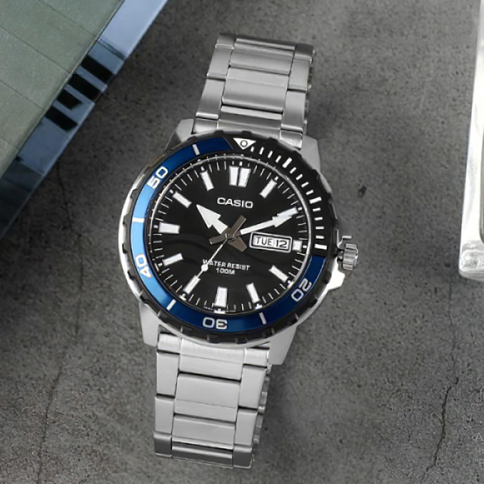 Мужские кварцевые часы Casio MTD-125D-1A2. Калибр механизма — 5716. На циферблате отображается день недели и текущая дата. Стрелки и метки покрыты люминесцентным напылением (светятся в темноте). Стальной браслет. Вращающийся безель из пластика и алюминия. Водонепроницаемость WR100 (10 атм). Размеры корпуса: (ШxВxТ) 45.6x46.5x10.4 мм. Гарантийный срок — 3 года (1 год от производителя + 2 года от магазина).