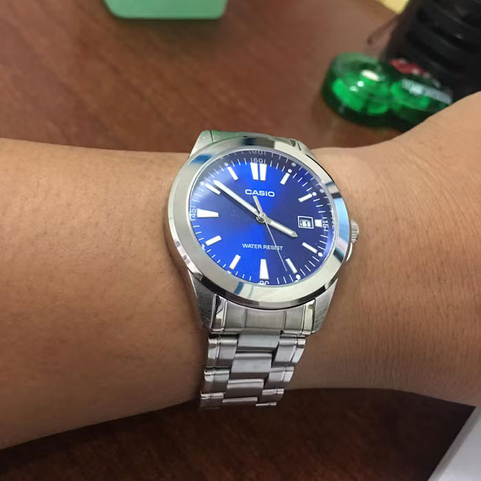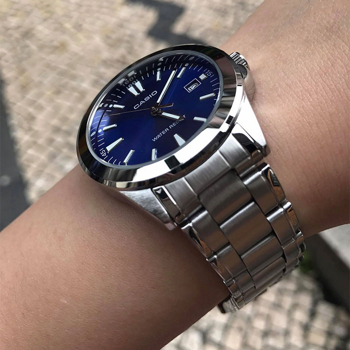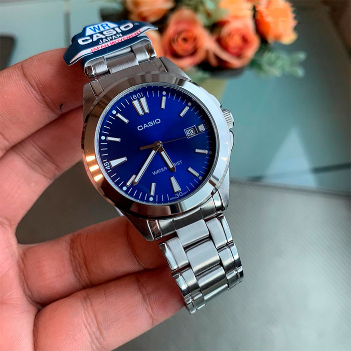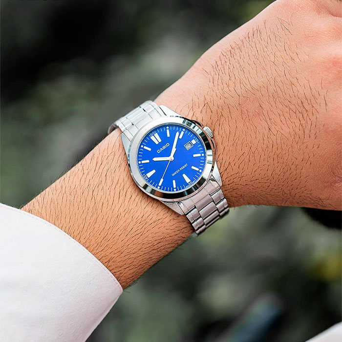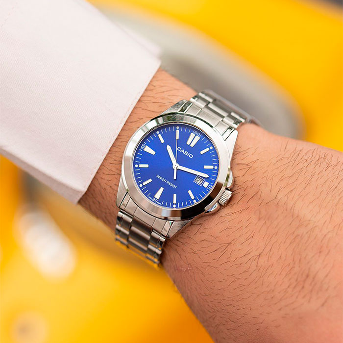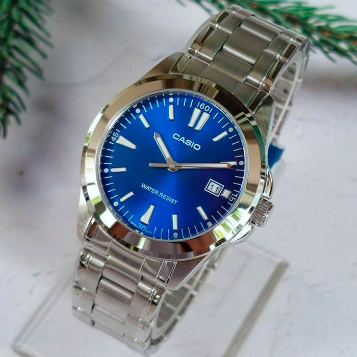 Мужские кварцевые часы Casio MTP-1215A-2A2. Калибр механизма — 2784. На циферблате отображается текущая дата. Стрелки и метки покрыты люминесцентным напылением (светятся в темноте). Стальной браслет. Водонепроницаемость WR (3 атм). Размеры корпуса: (ШxВxТ) 38.4x43.3x8.8 мм. Гарантийный срок — 3 года (1 год от производителя + 2 года от магазина).