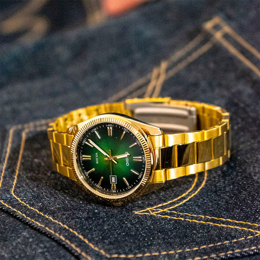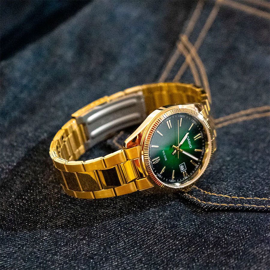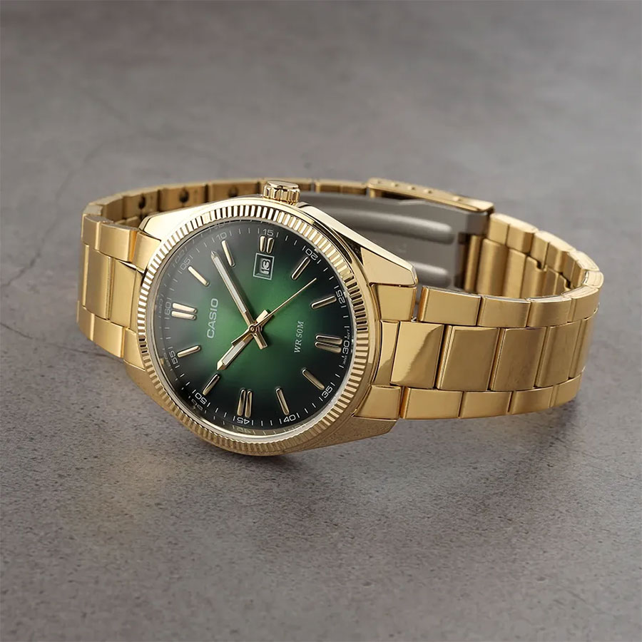 Мужские кварцевые наручные часы Casio MTP-1302PGC-3A. Калибр механизма — 2784. На данной модели отображается текущая дата. Стрелки покрыты люминесцентным напылением (светятся в темноте). На корпус и браслет нанесено стойкое покрытие. Водонепроницаемость WR50 (5 атм). Размеры корпуса: (ШxВxТ) 38.5x44.2x9.3 мм. Гарантийный срок — 3 года (1 год от производителя + 2 года от магазина).