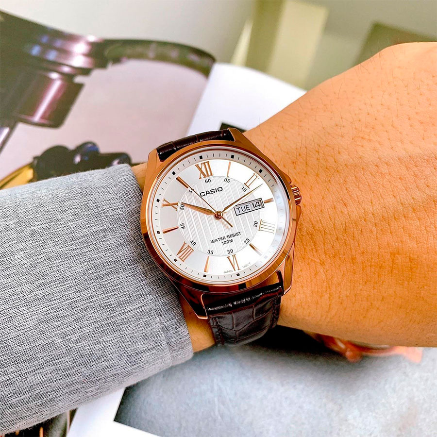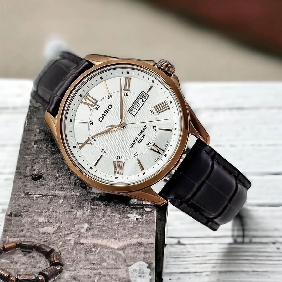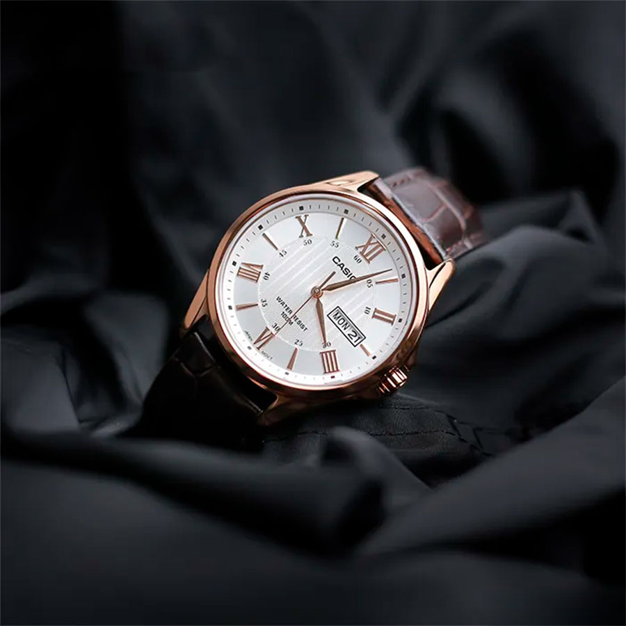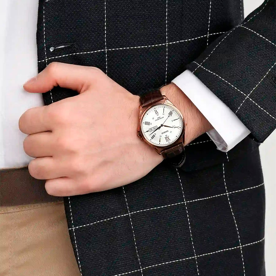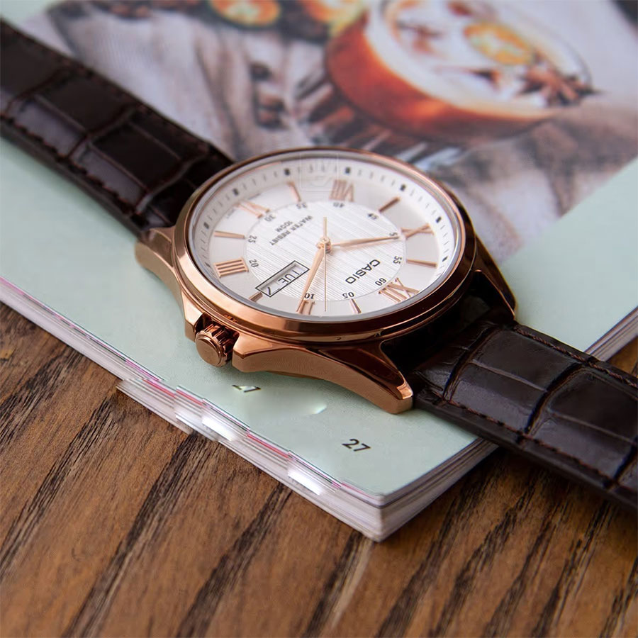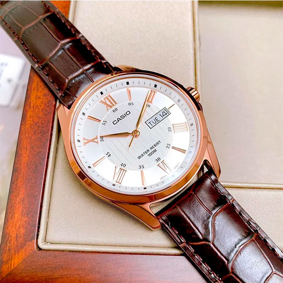 Мужские кварцевые наручные часы Casio MTP-1384L-7A. Калибр механизма — 5339. На данной модели отображается день недели и текущая дата. На корпус нанесено стойкое PVD покрытие. Кожаный ремешок. Водонепроницаемость WR100 (10 атм). Размеры корпуса: (ШxВxТ) 41x47x10 мм. Гарантийный срок — 3 года (1 год от производителя + 2 года от магазина).