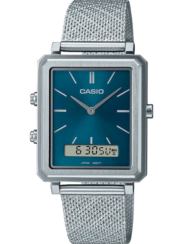 Мужские кварцевые наручные часы Casio MTP-B205M-3E с цифровой+стрелочной индикацией времени. Калибр механизма — 5154. Функциональность данной модели: формат времени 12/24, автоматический календарь, двойное время, будильник, сигнал начала часа, секундомер с точностью 1/100 секунды и измерением до 59 минут 59 cек. Стальной браслет миланского плетения. Водонепроницаемость WR (3 атм). Размеры корпуса: (ШxВxТ) 30x42x8 мм. Гарантийный срок — 3 года (1 год от производителя + 2 года от магазина).