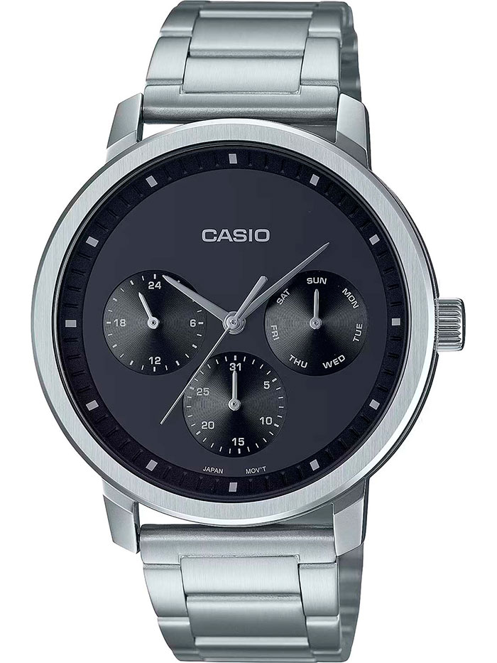 Мужские кварцевые наручные часы Casio MTP-B305D-1E. Калибр механизма — 5494. На данной модели отображается день недели, текущая дата и время суток в 24-х часовом формате. Стальной браслет. Водонепроницаемость WR50 (5 атм). Размеры корпуса: (ШxВxТ) 41x47x10.3 мм. Гарантийный срок — 3 года (1 год от производителя + 2 года от магазина).