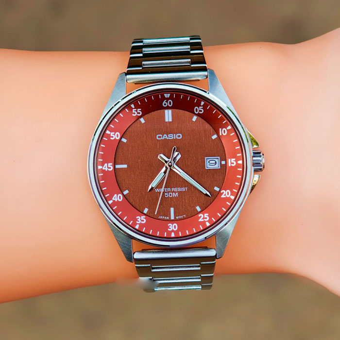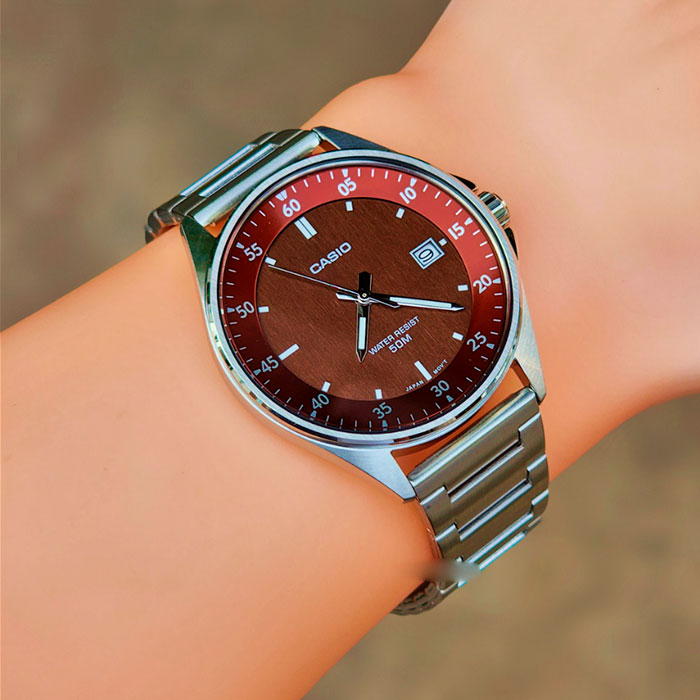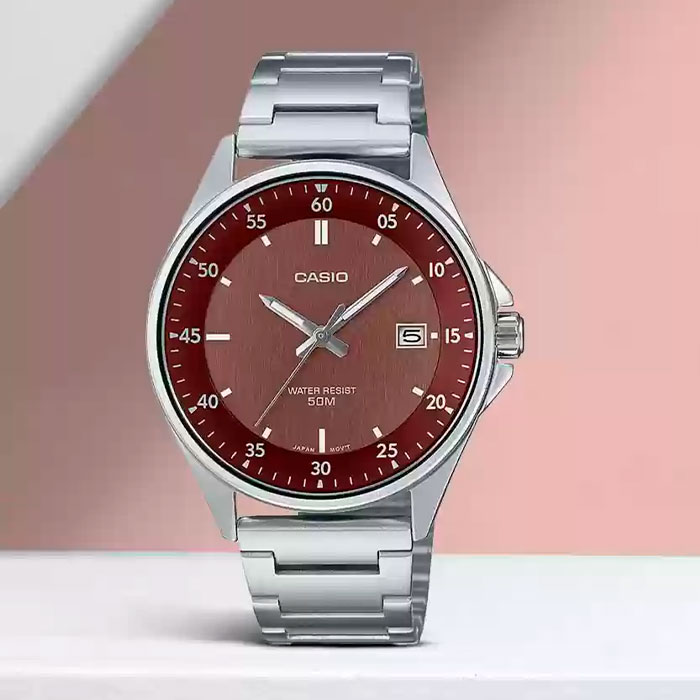 Мужские кварцевые наручные часы Casio MTP-E705D-5E. Калибр механизма — 5664. На данной модели отображается текущая дата. Стрелки покрыты люминесцентным напылением (светятся в темноте). Стальной браслет. Водонепроницаемость WR50 (5 атм). Размеры корпуса: (ШxВxТ) 41.9x46.8x8.2 мм. Гарантийный срок — 3 года (1 год от производителя + 2 года от магазина).