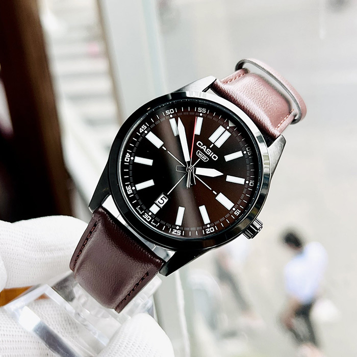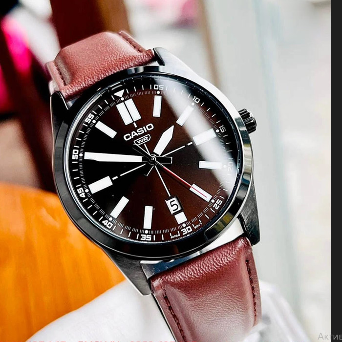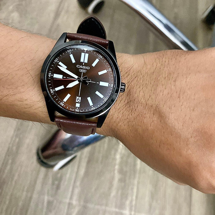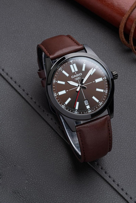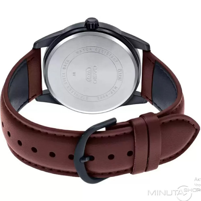 Мужские кварцевые наручные часы Casio MTP-VD02BL-5E. Калибр механизма — 5128. На данной модели отображается текущая дата. Стрелки и метки покрыты люминесцентным напылением (светятся в темноте). Ремешок из искусственной кожи. На корпус нанесено стойкое покрытие. Водонепроницаемость WR (3 атм). Размеры корпуса: (ШхВхТ) 41x48x9.6 мм Гарантийный срок — 3 года (1 год от производителя + 2 года от магазина).