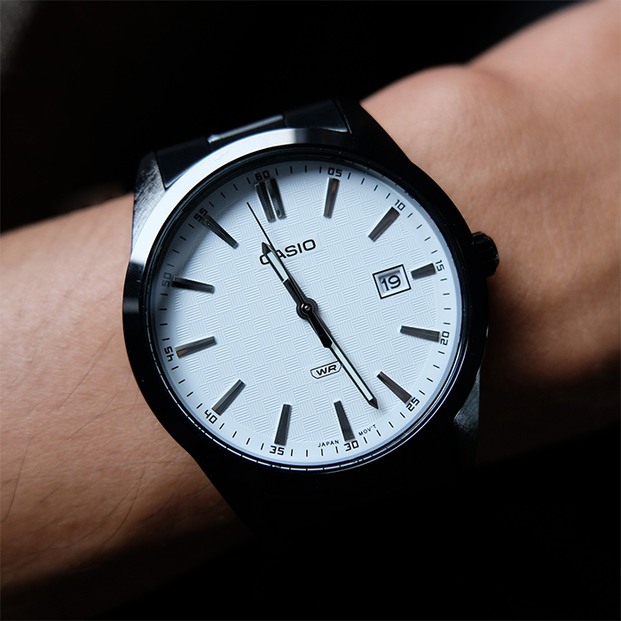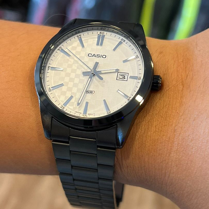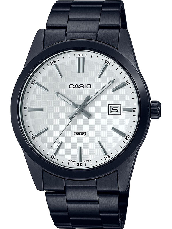 Мужские кварцевые наручные часы Casio MTP-VD03B-7A. Калибр механизма — 5058. На данной модели отображается текущая дата. Стрелки покрыты люминесцентным напылением (светятся в темноте). Стальной браслет. На корпус и браслет нанесено стойкое покрытие. Водонепроницаемость WR (3 атм). Размеры корпуса: (ШхВхТ) 41x48x9.6 мм Гарантийный срок — 3 года (1 год от производителя + 2 года от магазина).