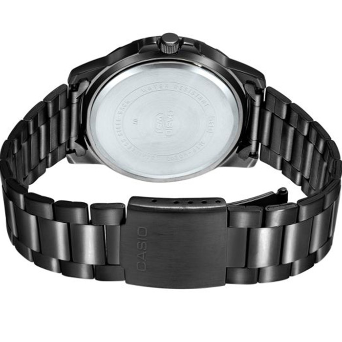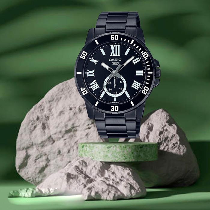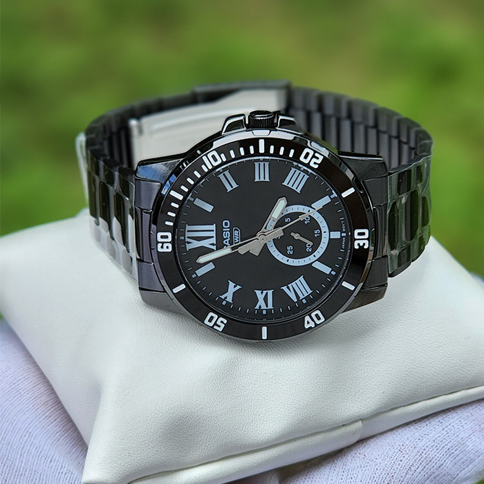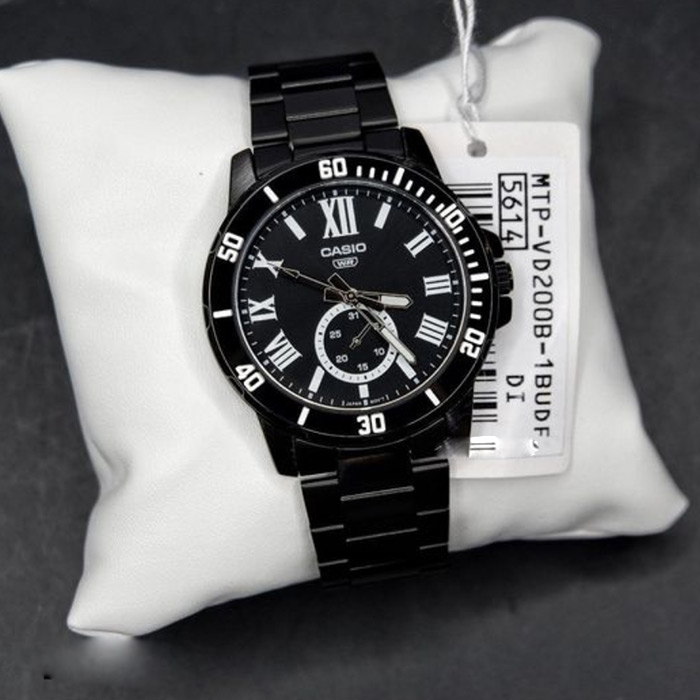 Мужские кварцевые наручные часы Casio MTP-VD200B-1B. Калибр механизма — 5614. На данной модели отображается текущая дата. Стрелки покрыты люминесцентным напылением (светятся в темноте). Стальной браслет. На корпус и браслет нанесено стойкое покрытие. Водонепроницаемость WR (3 атм). Размеры корпуса: (ШхВхТ) 45x49x8.7 мм Гарантийный срок — 3 года (1 год от производителя + 2 года от магазина).