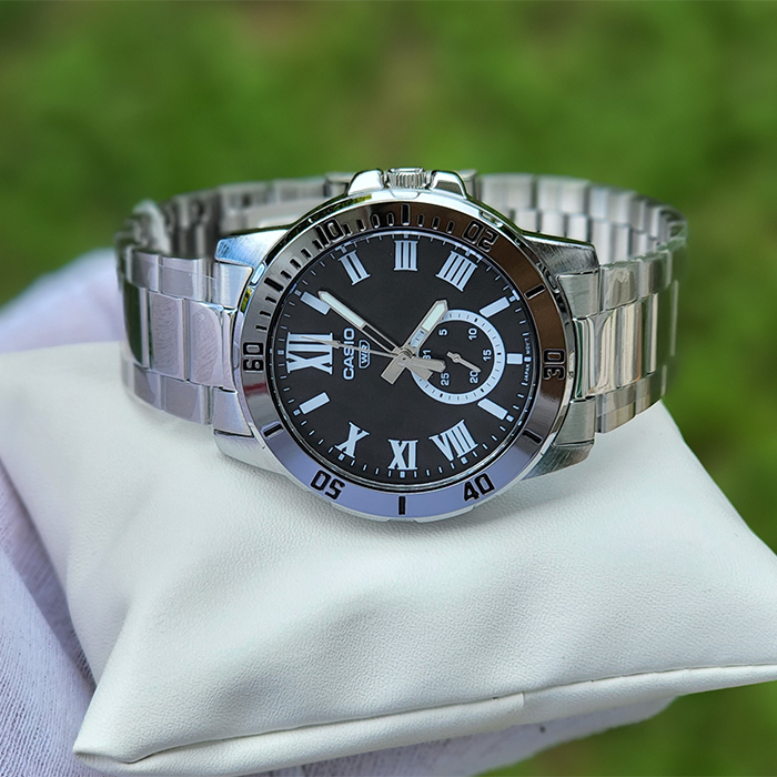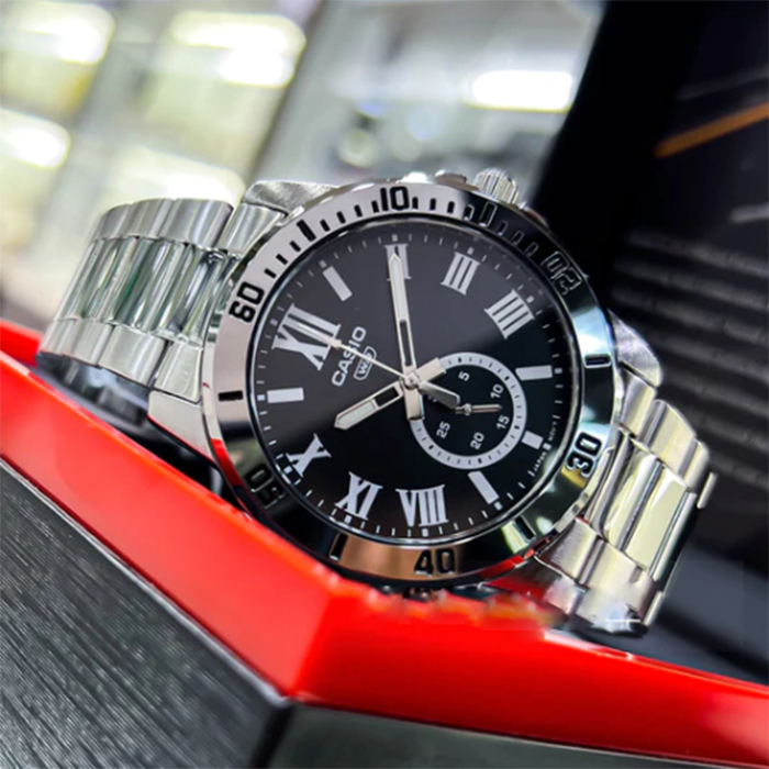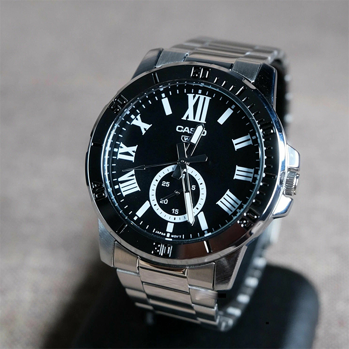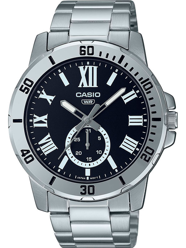 Мужские кварцевые наручные часы Casio MTP-VD200D-1B. Калибр механизма — 5614. На данной модели отображается текущая дата. Стрелки покрыты люминесцентным напылением (светятся в темноте). Стальной браслет. Водонепроницаемость WR (3 атм). Размеры корпуса: (ШхВхТ) 45x49x8.7 мм Гарантийный срок — 3 года (1 год от производителя + 2 года от магазина).